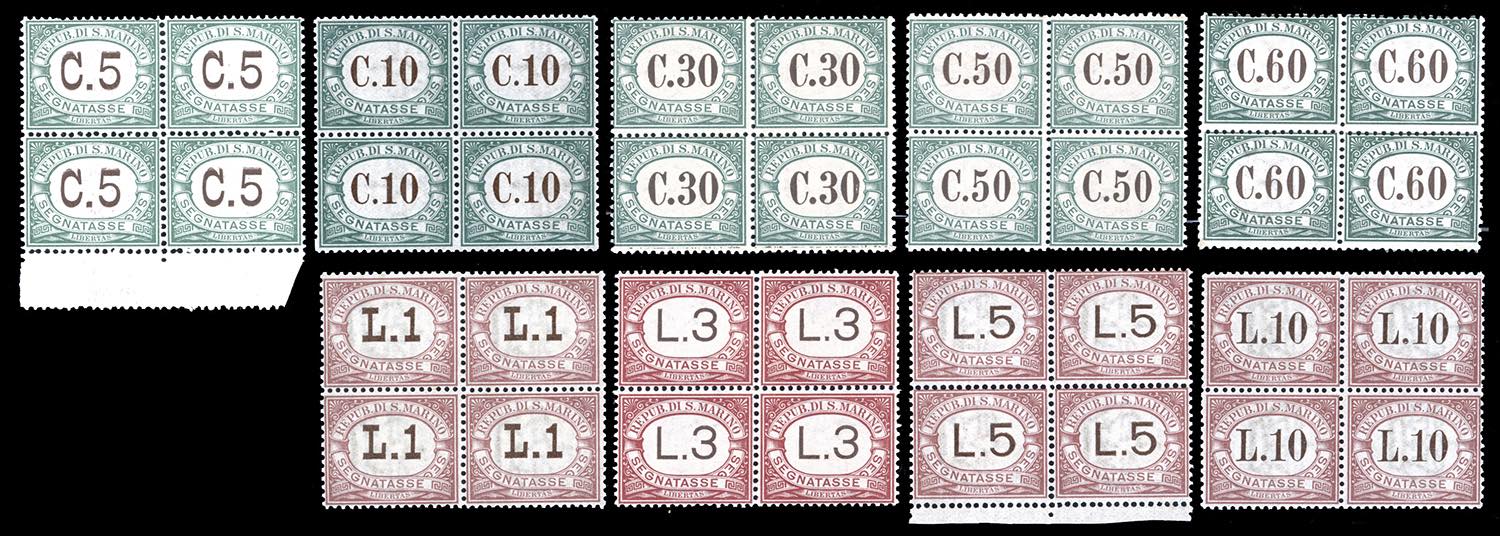 1897/1919 - Prima emissione, serie completa (1/9), blocchi di quattro, gomma originale integra, perfetti e di ottima qualità. Belli e ... Leggi tutto