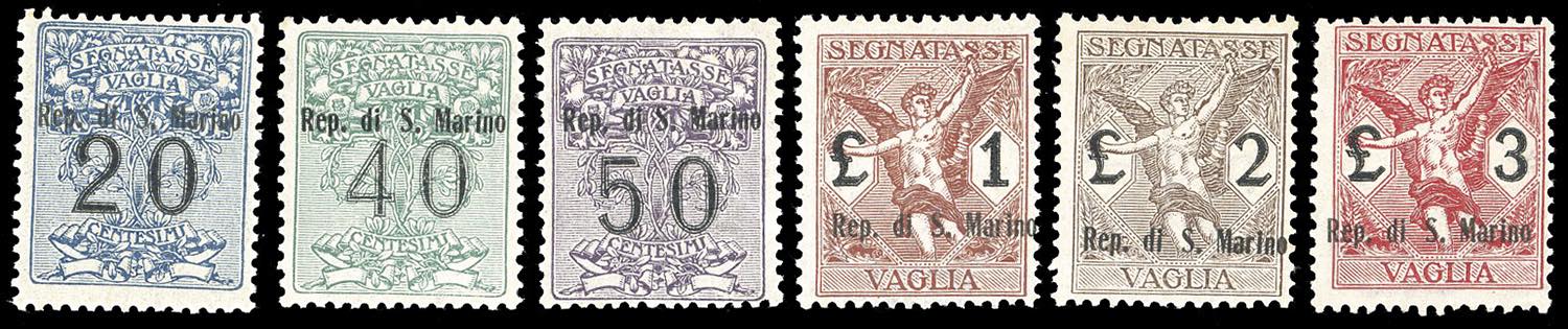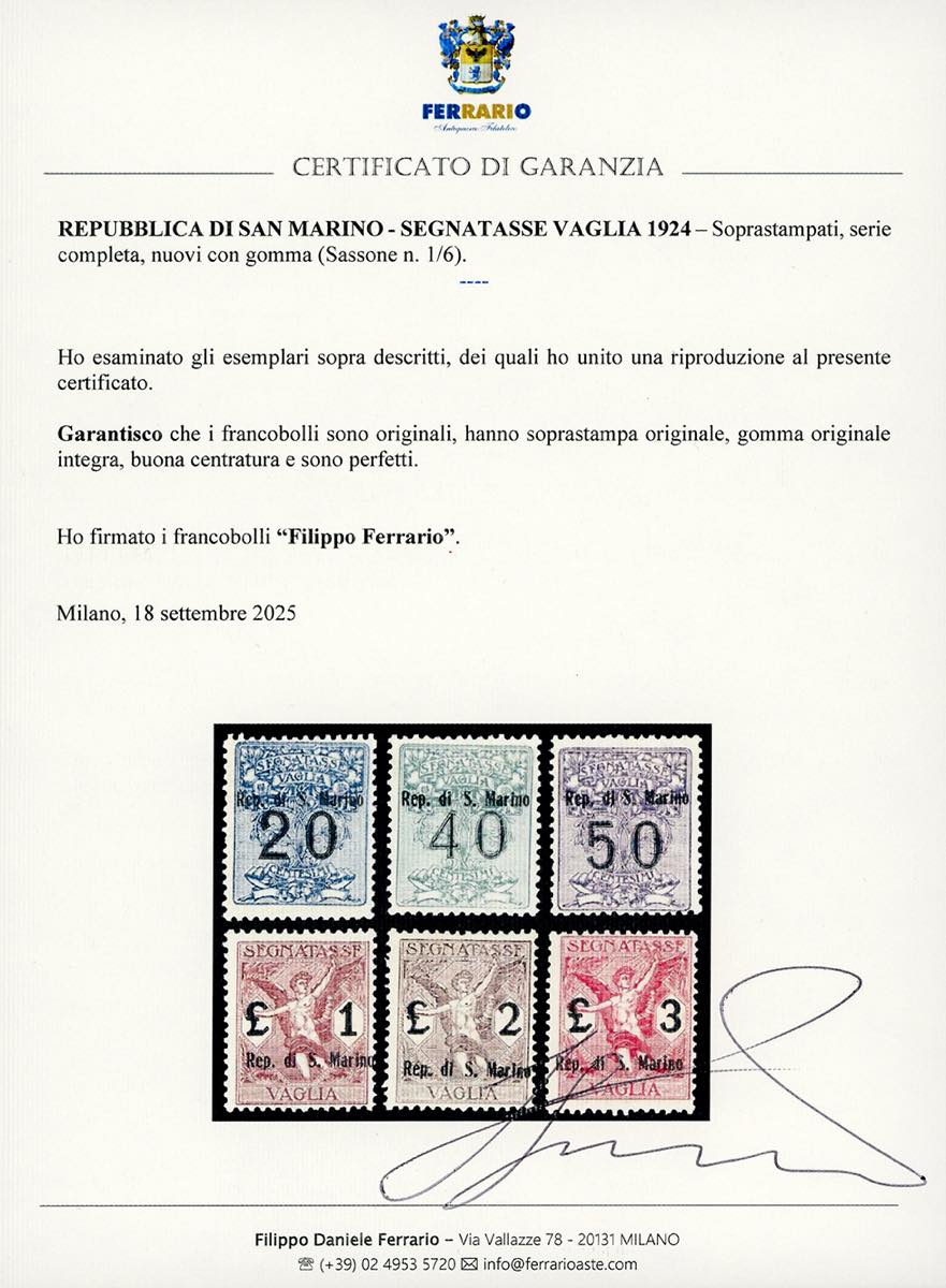 1924 - Soprastampati, serie completa (1/6), nuovi, gomma originale integra, perfetti. G.Bolaffi per l'alto valore, la serie firmata Sassone ... Leggi tutto