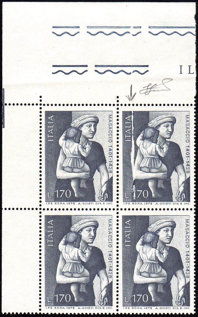 1978 - 170 lire Masaccio (1429), blocco di quattro, un esemplare con bella carenza di stampa, angolo di foglio, gomma integra, perfetto. Ferrario.