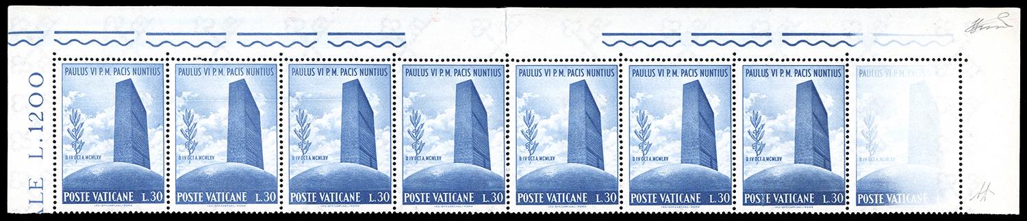 1965 - 30 lire Paolo VI all'ONU, striscia orizzontale di otto, dentellatura verticale aperta al centro, l'ultimo esemplare con stampa ... Leggi tutto