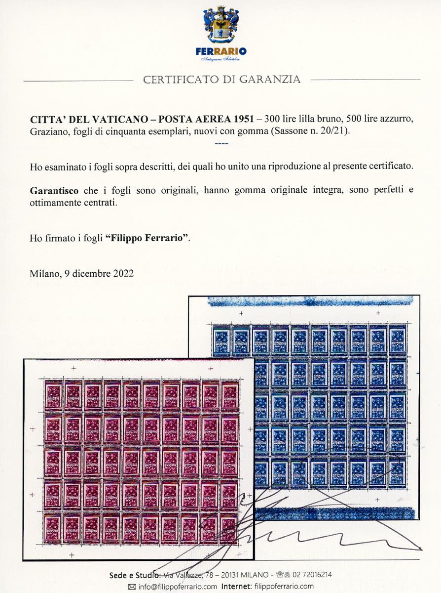 1951 - Graziano, serie completa in fogli di 50 esemplari (20/21), nuovi, gomma originale integra, perfetti. Splendidi e ottimamente centrati. Qualità lusso. Estremamente rari. Cert. Ferrario.