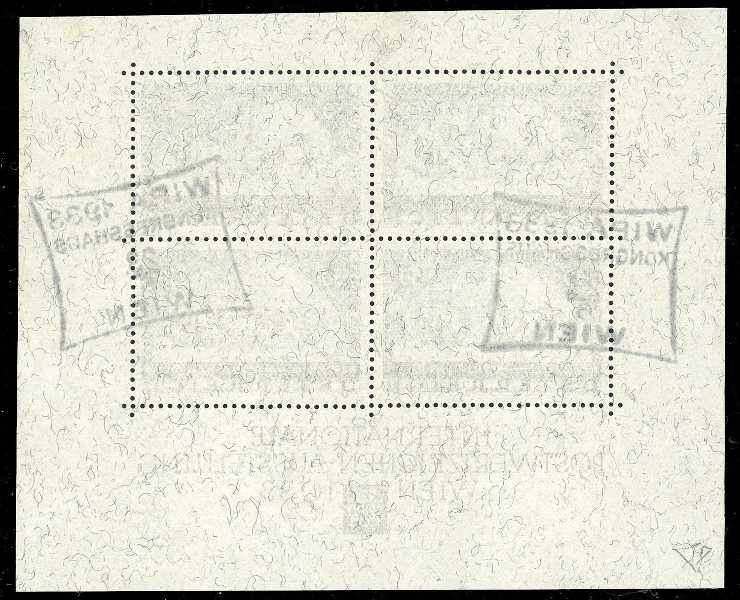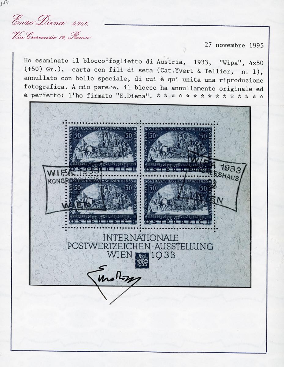 AUSTRIA FOGLIETTI 1933 - 50 + 50 g. WIPA, foglietto (1), usato con l'annullo speciale della manifestazione, perfetto. Cert. Diena.