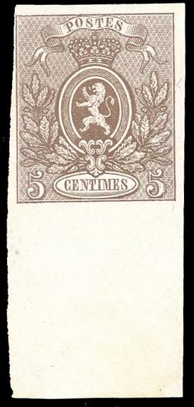 BELGIO 1866 - 5 cent. bruno grigio, Stemma, prova non dentellata su carta sottile (25), bordo di foglio, nuova senza gomma, perfetta. Non ... Leggi tutto