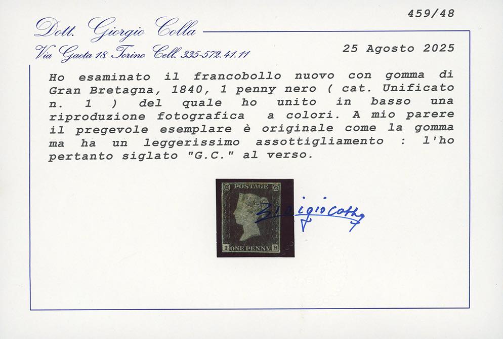 GRAN BRETAGNA 1840 - 1 penny nero, Penny Black (1), I-B, nuovo, gomma originale, difettoso. Ottimo aspetto. Cert. Colla.