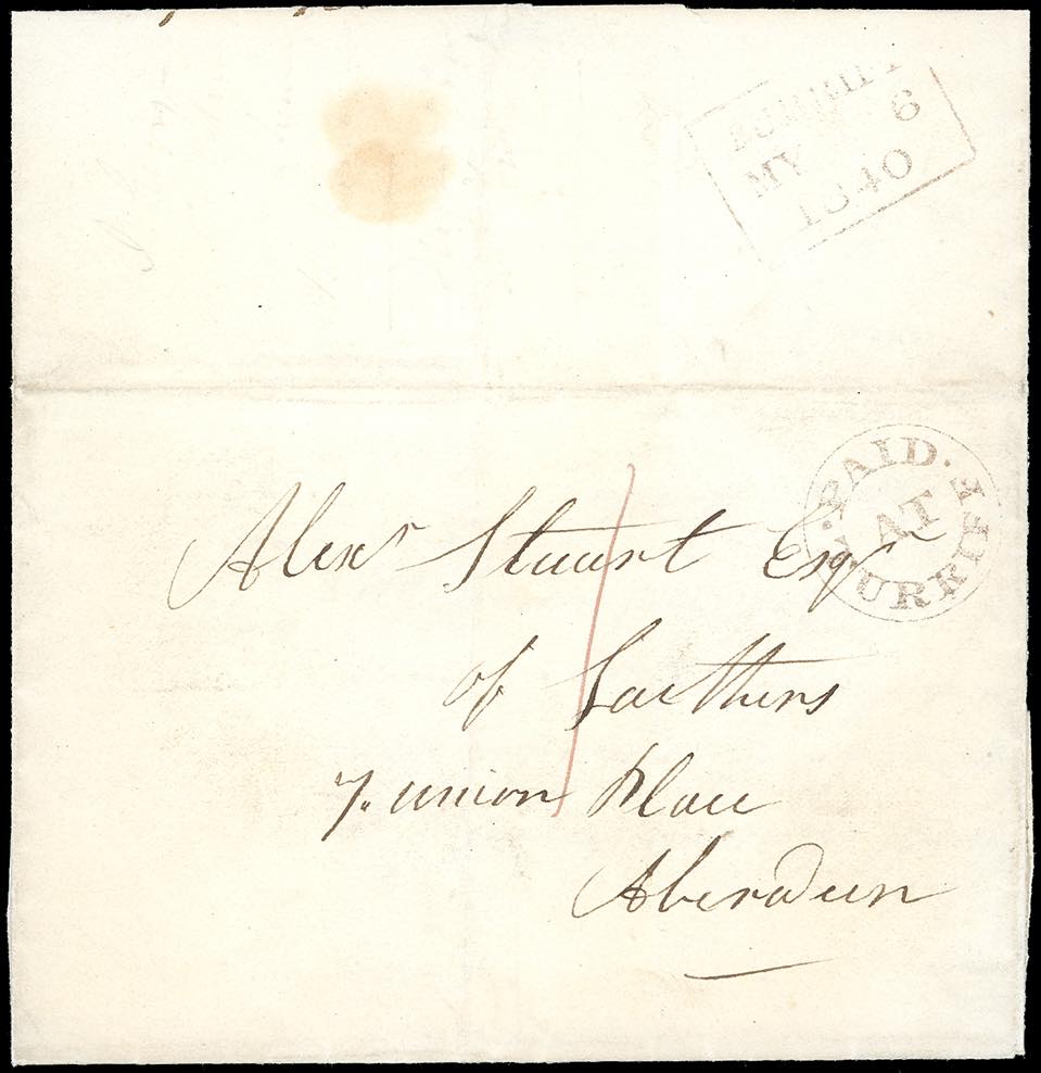 GRAN BRETAGNA 1840 - Lettera non affrancata pagata in contanti da Turriff 6/5/1840, giorno di emissione del Penny Black, ad Aberdeen, in Scozia, al verso il bollo in cartella "TURRIFF/MY6/1840" e sul fronte il bollo in cerchio "PAID AT TURRIFF". Interessante e rara.