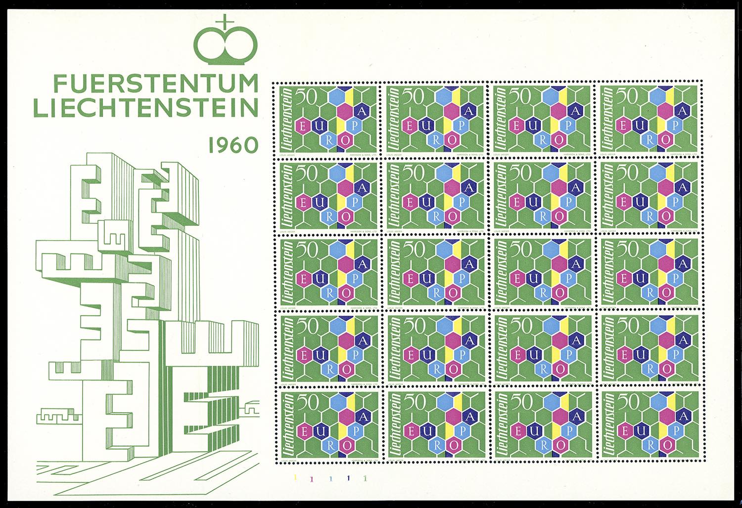 LIECHTENSTEIN 1960 - 50 r. Europa (355), minifoglio di 20 esemplari, nuovo, gomma originale integra, perfetto, molto bello. Cert. Raybaudi.