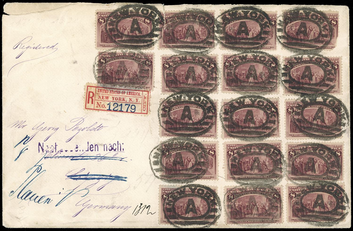 STATI UNITI 1893 - 8 cent. Colombo (Yv.87), diciasette esemplari, su busta raccomandata da New York 8/2/1893 per la Germania, rispedita. Rara affrancatura monovalore.