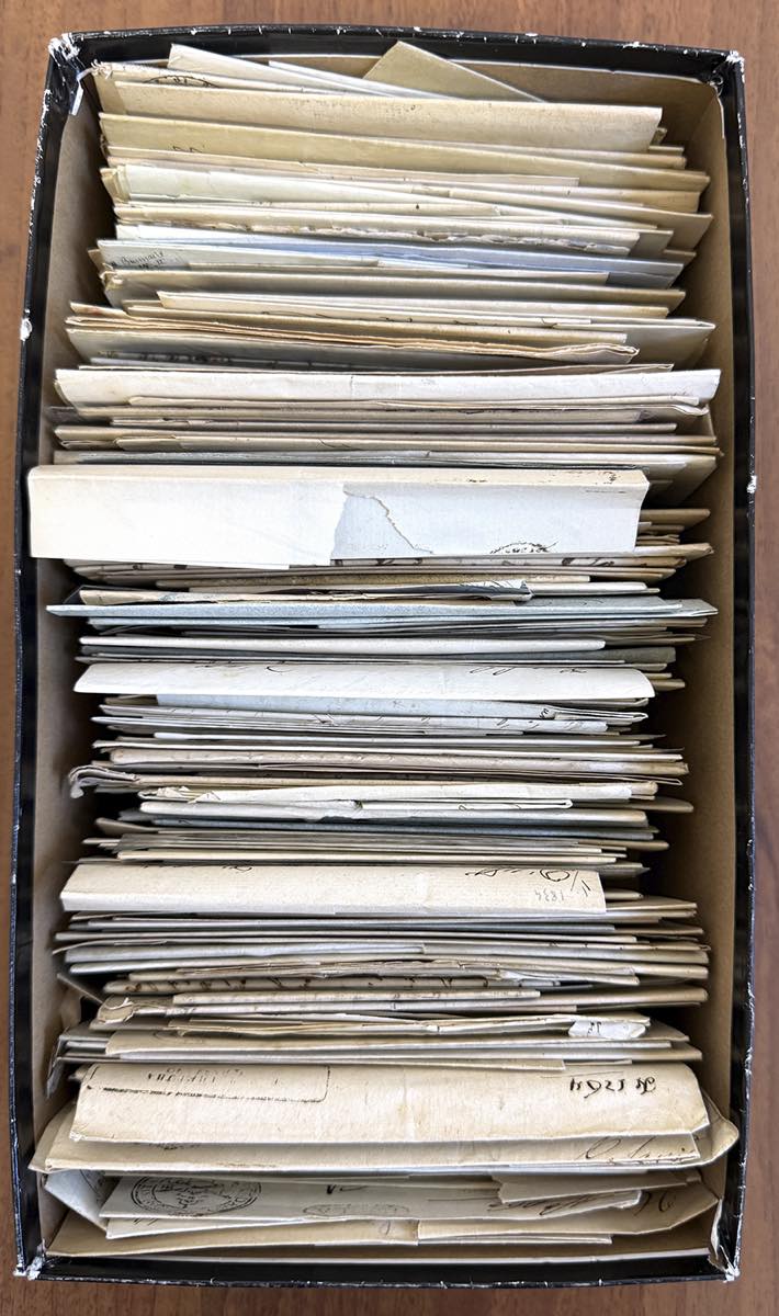 PREFILATELICHE 1820/1860 - Numerose decine di lettere prefilateliche o non affrancate del periodo, con ottima varietà di bolli, in una scatola.