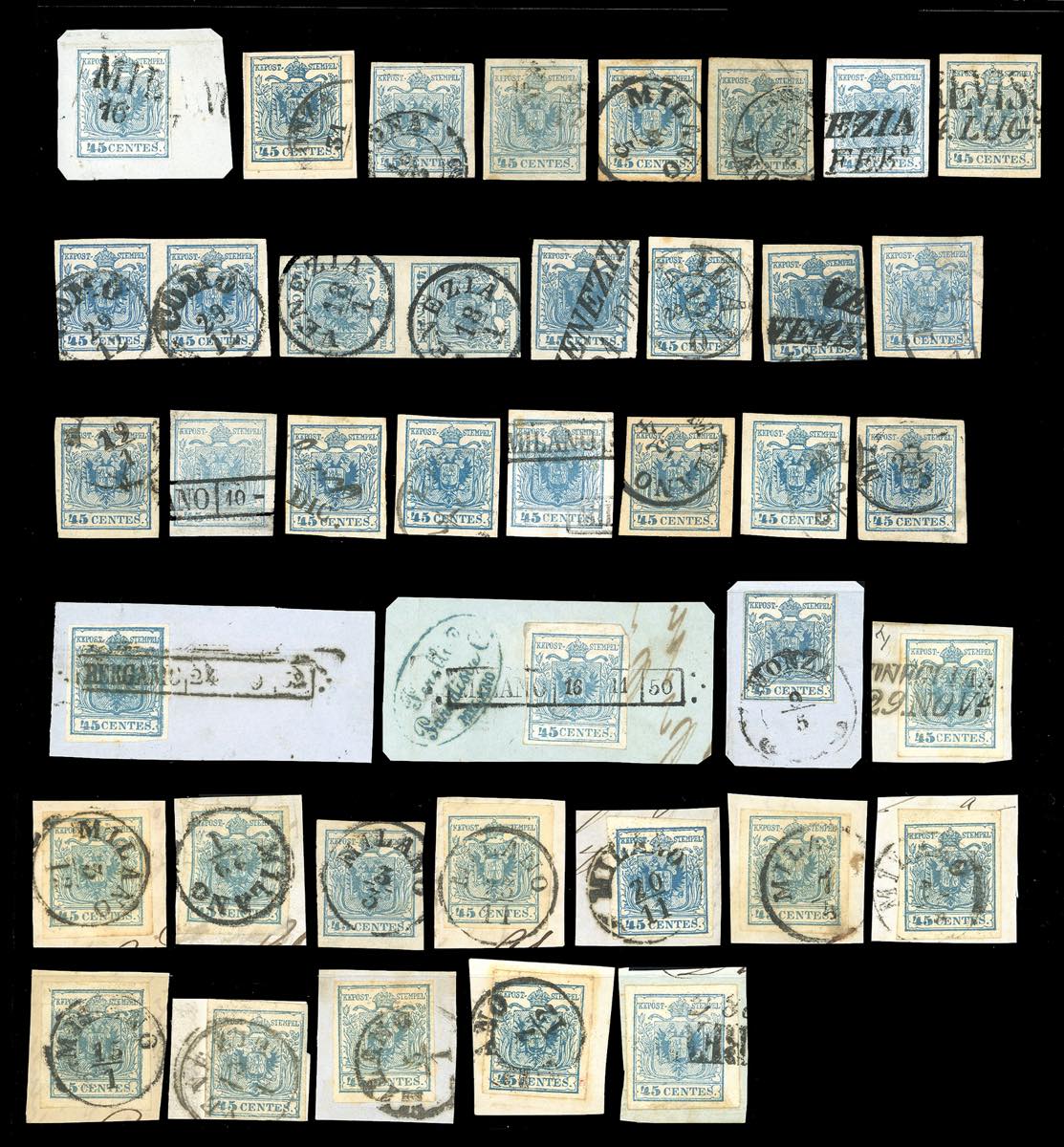 LOMBARDO VENETO 1850/1858 - Bell'insieme di 40 esemplati usati del francobollo da 45 cent. della I emissione, con ottima varietà di tipi, carte e colori. Per specialista.