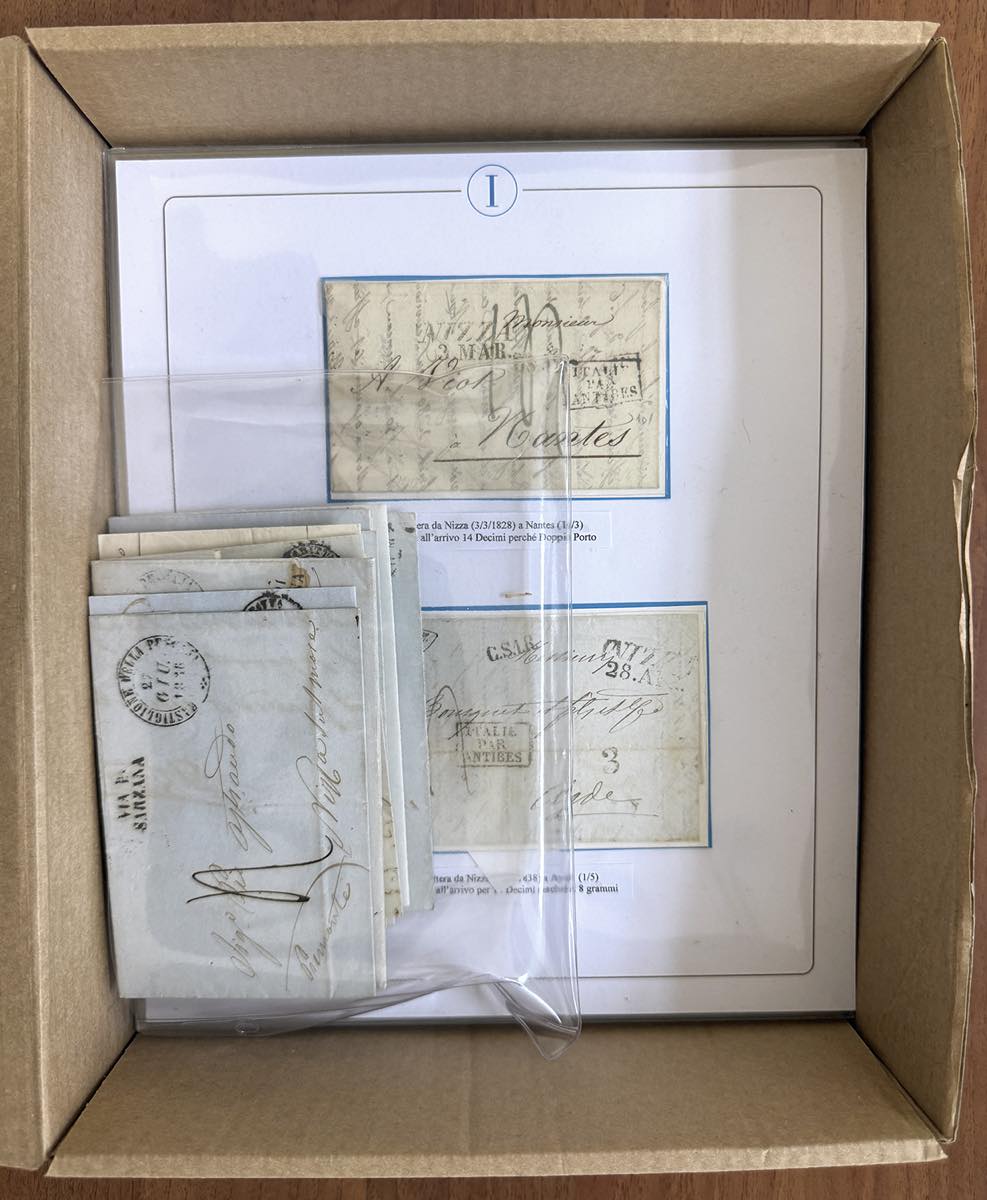 SARDEGNA CONTEA DI NIZZA 1777/1859 - Bella collezione/studio in gran parte montata su fogli da esposizione, composta da 77 lettere prefilateliche o non affrancate, partite o indirizzate a Nizza Marittima, generalmente scambiate con gli Antichi Stati Italiani. Molto interessante per lo specialista. Ex collezione Imperato.