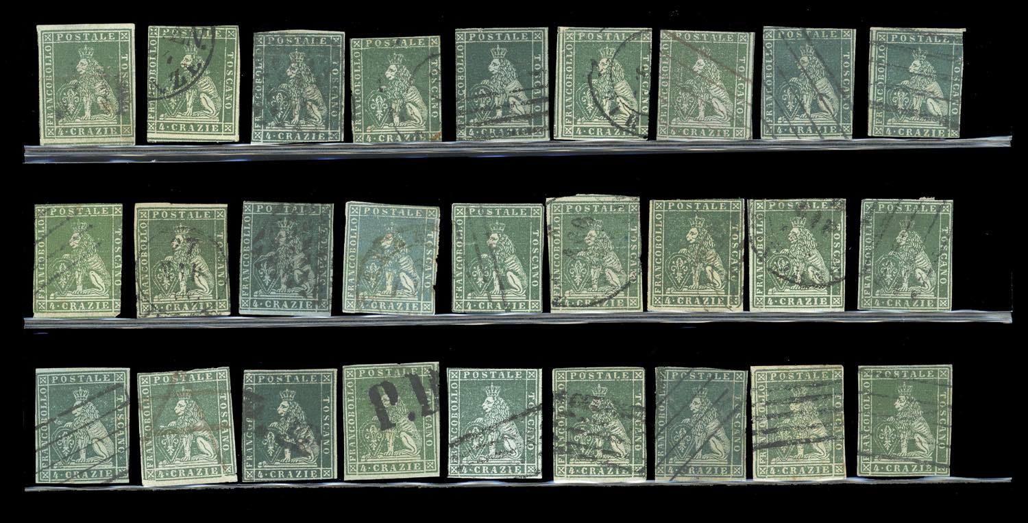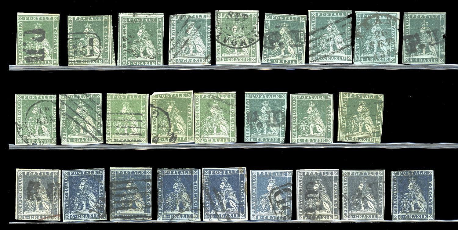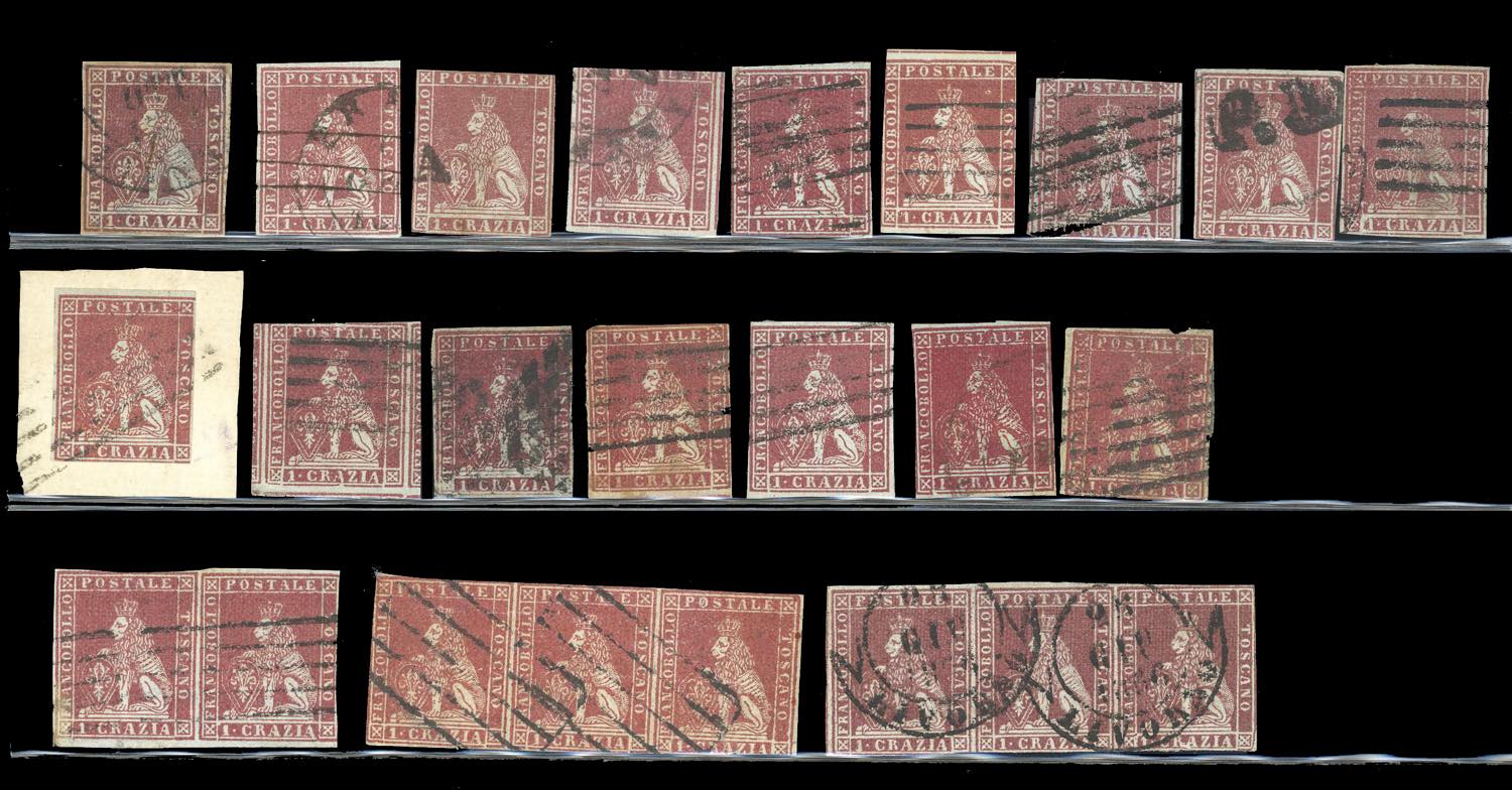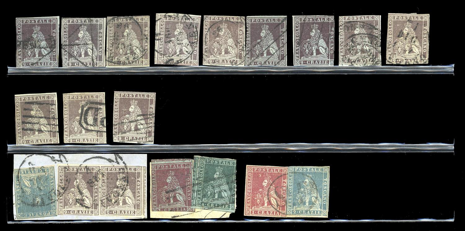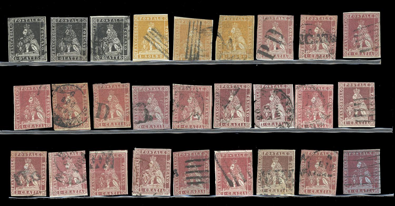 TOSCANA 1851 - Eccezionale accumulazione di 243 esemplari usati della prima emissione, tutti più o meno difettosi, con tinte non calcolate. Ottimo per studio delle varietà di carta, colore e clichè. Insieme di difficile reperibilità. Ex collezione Imperato.