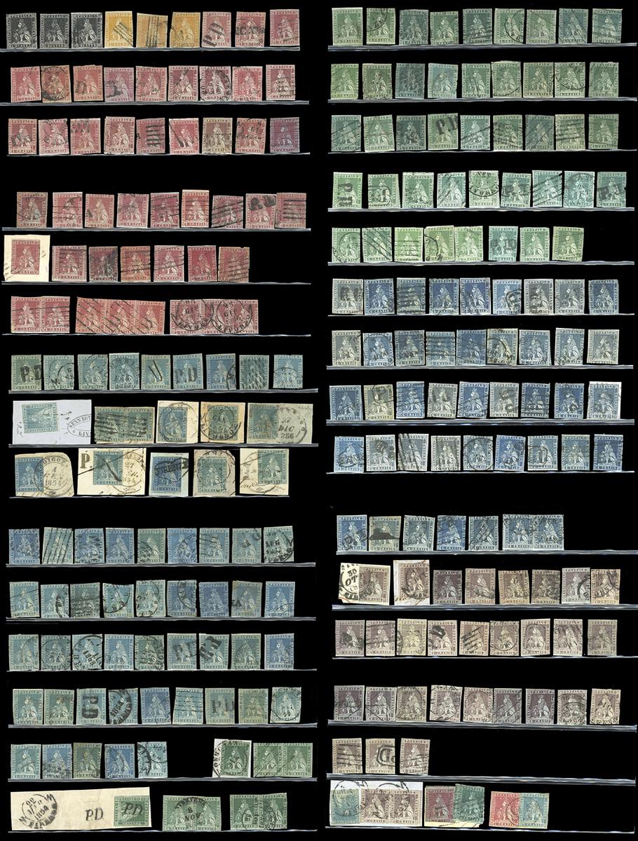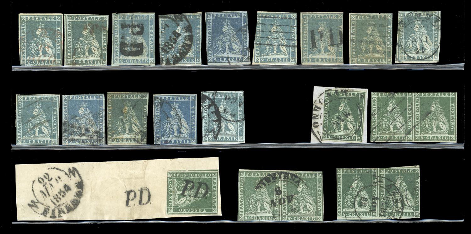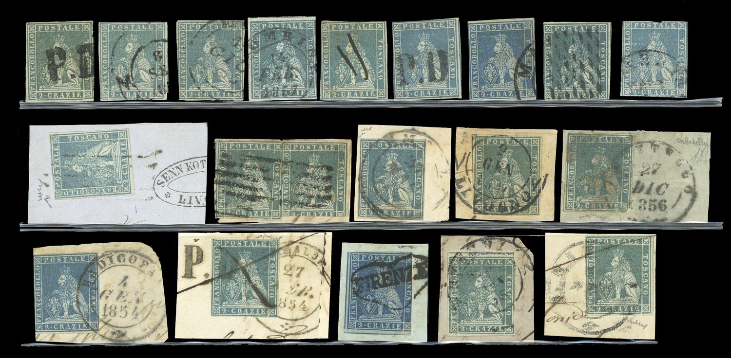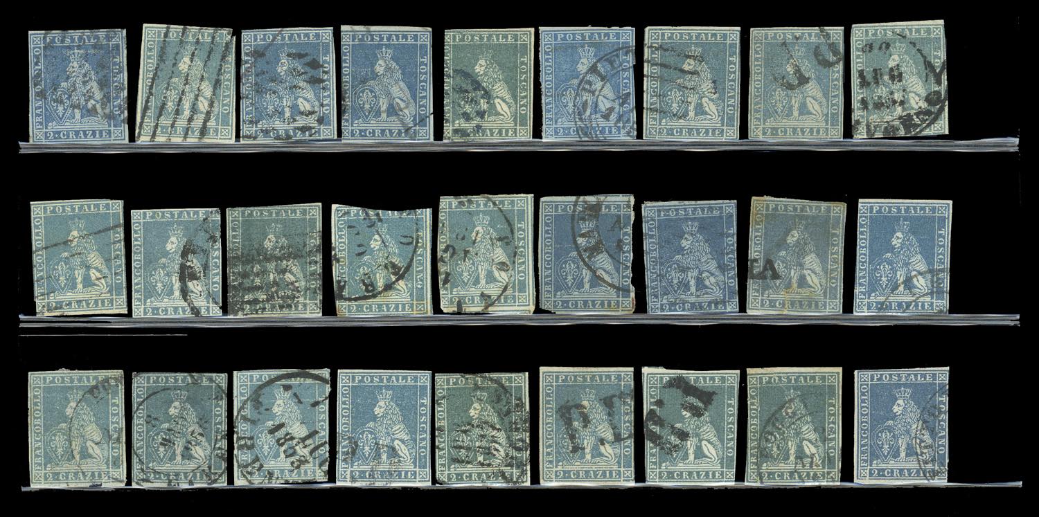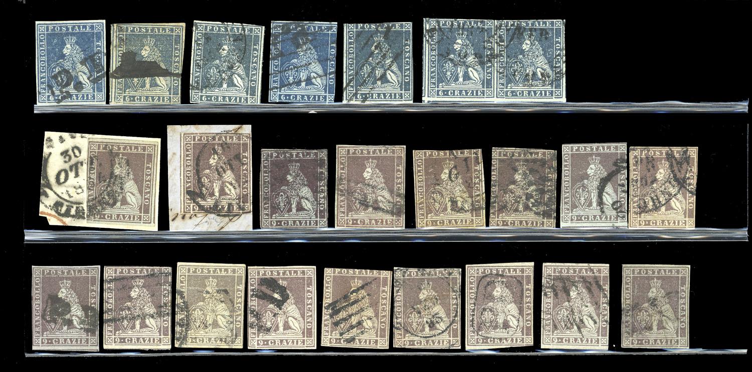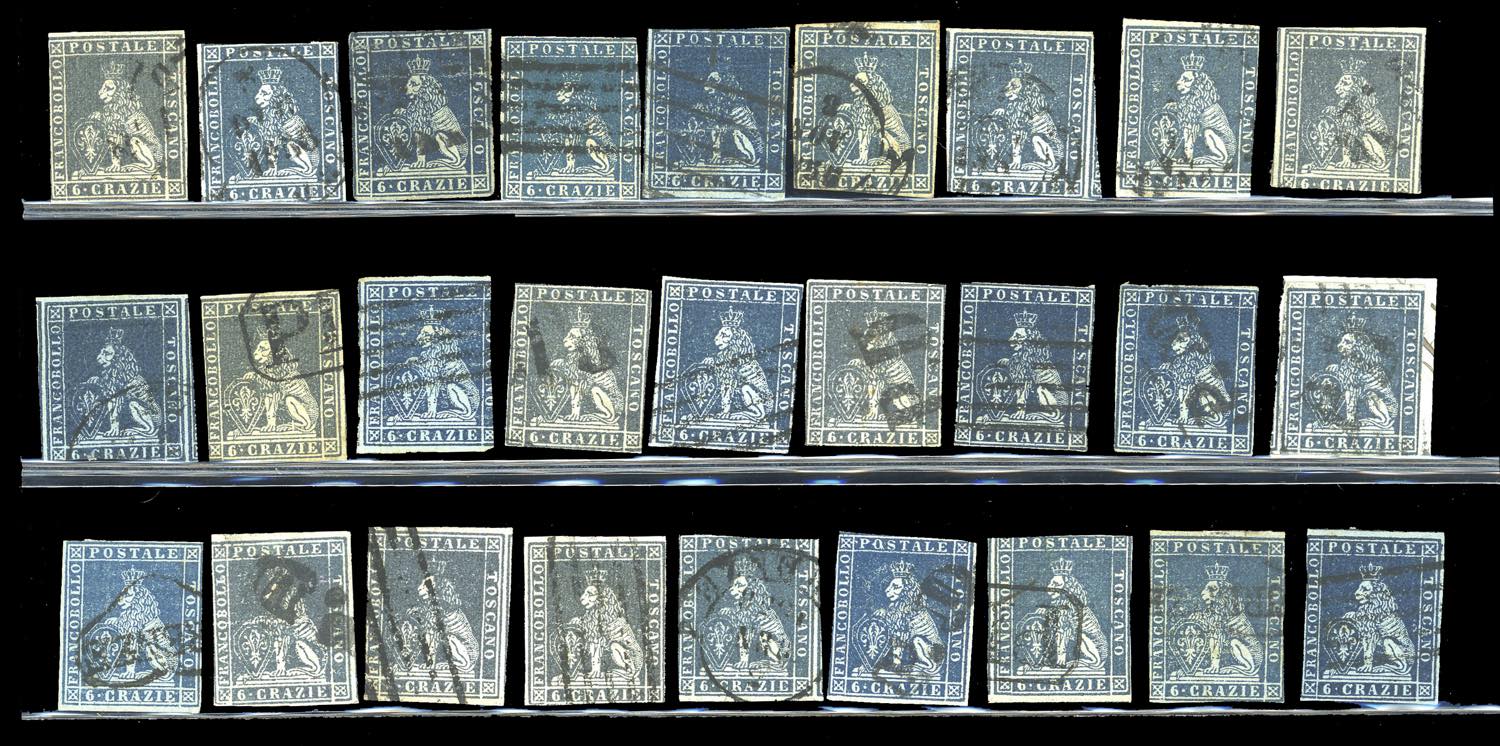 TOSCANA 1851 - Eccezionale accumulazione di 243 esemplari usati della prima emissione, tutti più o meno difettosi, con tinte non calcolate. Ottimo per studio delle varietà di carta, colore e clichè. Insieme di difficile reperibilità. Ex collezione Imperato.