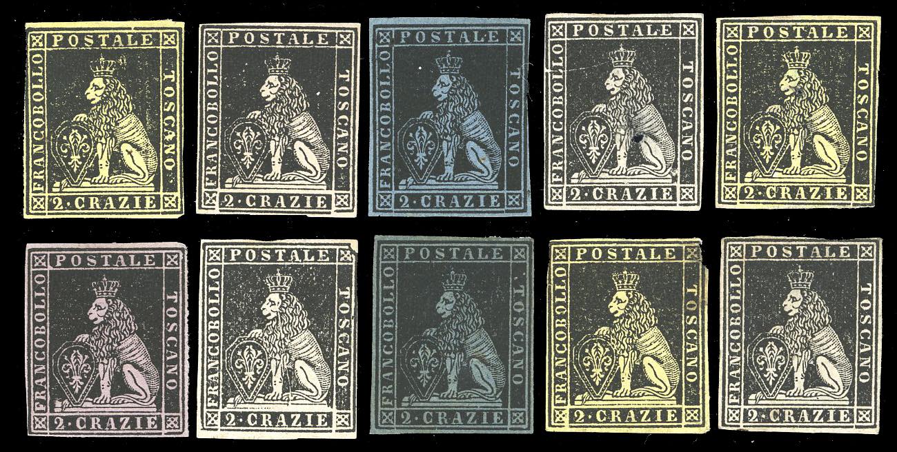 TOSCANA PROVE 1851 - Dieci prove del 2 crazie su carta bianca o colorata di vario spessore. Qualità mista. Insieme raro e di difficile ... Leggi tutto