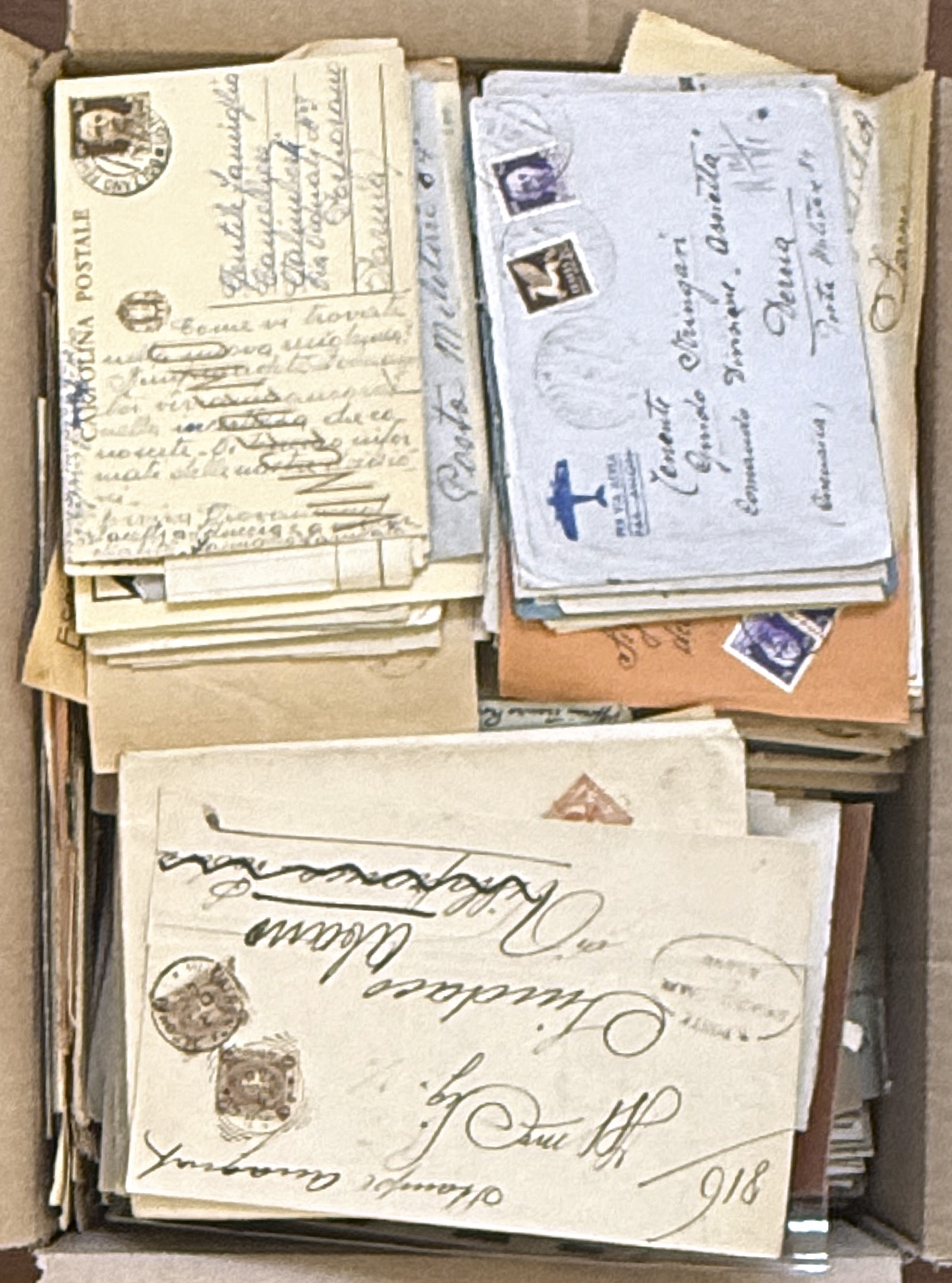 REGNO D'ITALIA 1900/1944 - Accumulazione di svariate centinaia di buste e cartoline, per lo più affrancate, in una grande scatola. Notate alcune interessanti e non comuni presenze, ottimo per dettaglio.