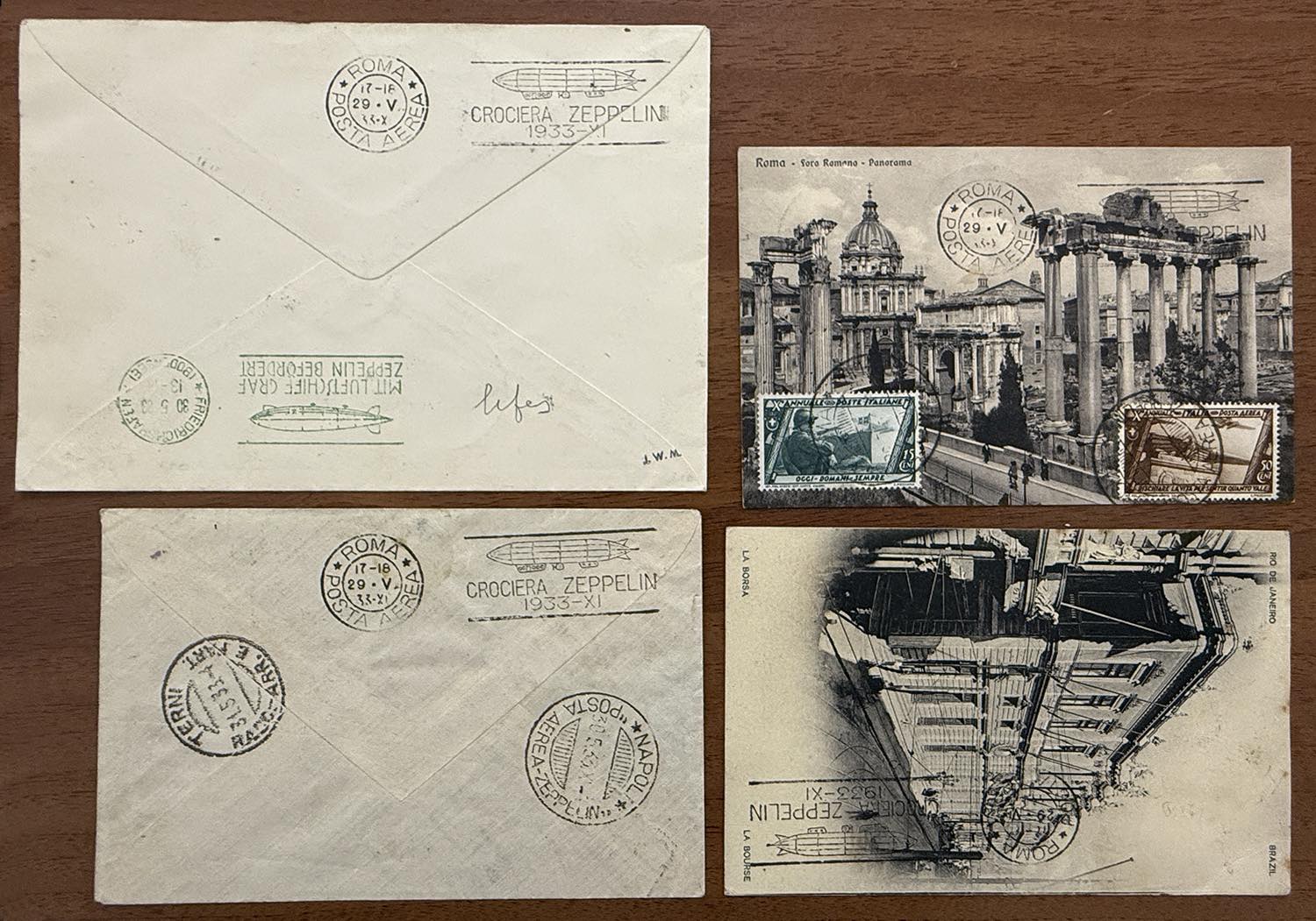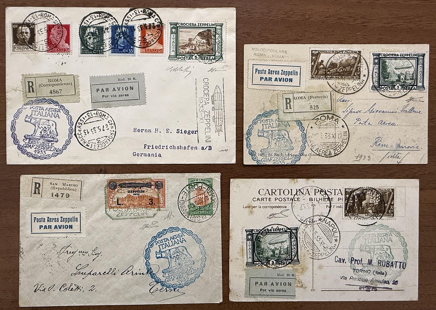REGNO D'ITALIA POSTA AEREA ZEPPELIN 1933 - Un aerogramma e due cartoline del Regno d'Italia viaggiati ed affrancati con rispettivi valori della Crociera, inoltre aerogramma di San Marino affrancato con il francobollo Zeppelin da 3 lire. Ottima qualità e firmate.