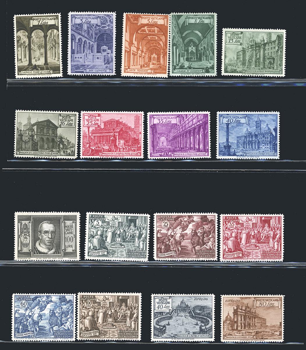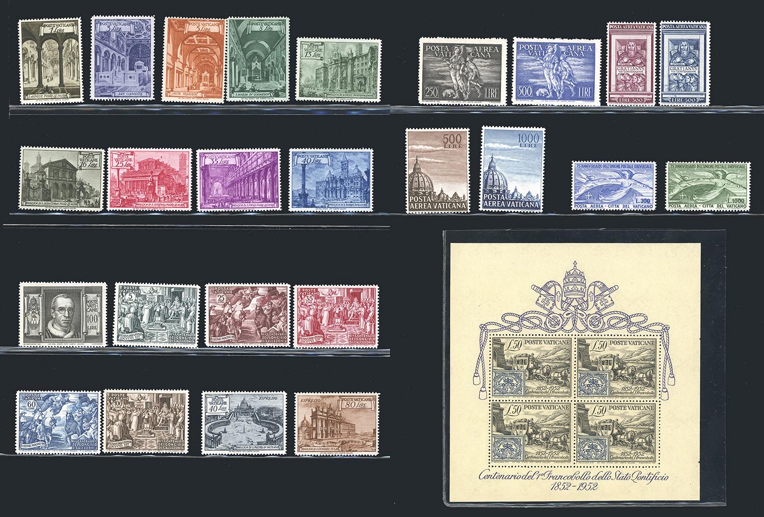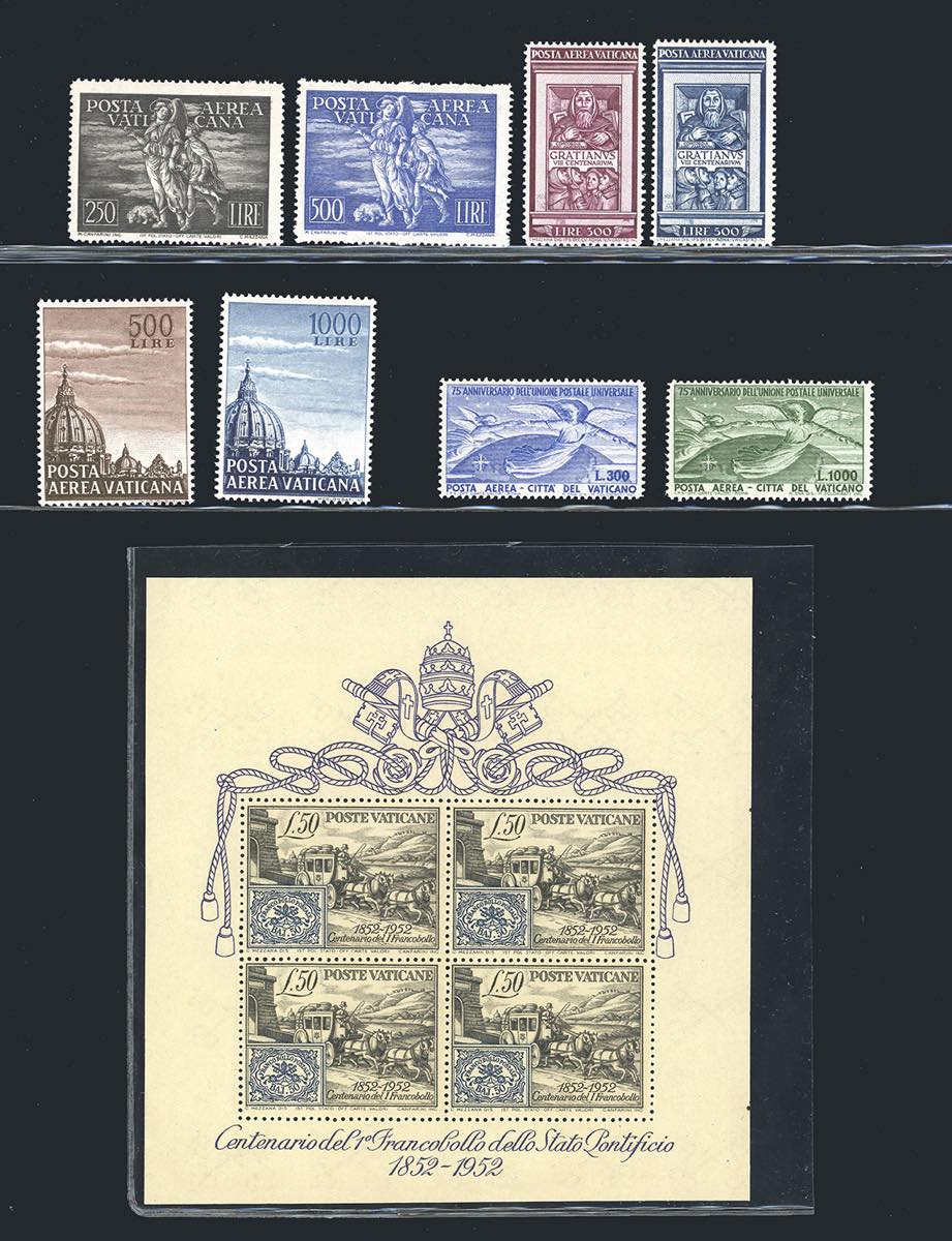 VATICANO 1948/1953 - Bell'insieme di serie complete: Basiliche, Archeologia, Foglietto Centenario, Posta aerea Tobia, Graziano, UPU e Cupoloni, tutti perfetti, con gomma originale integra, leggermente bicolore, tranne la serie Tobia che ha gomma uniforme.