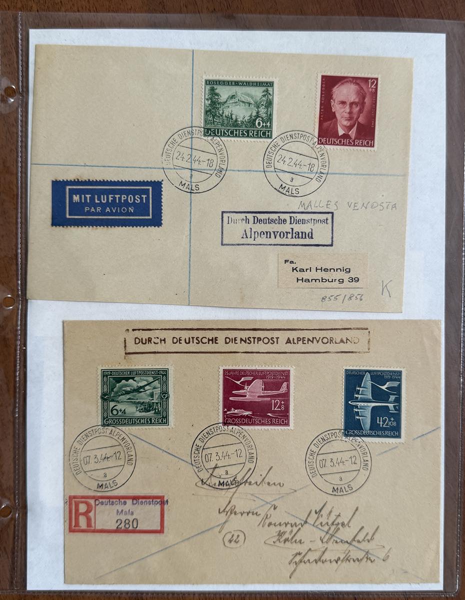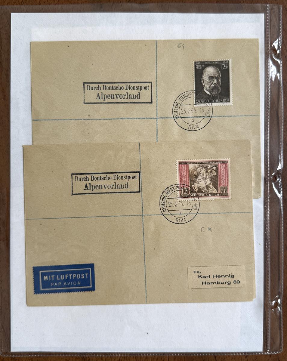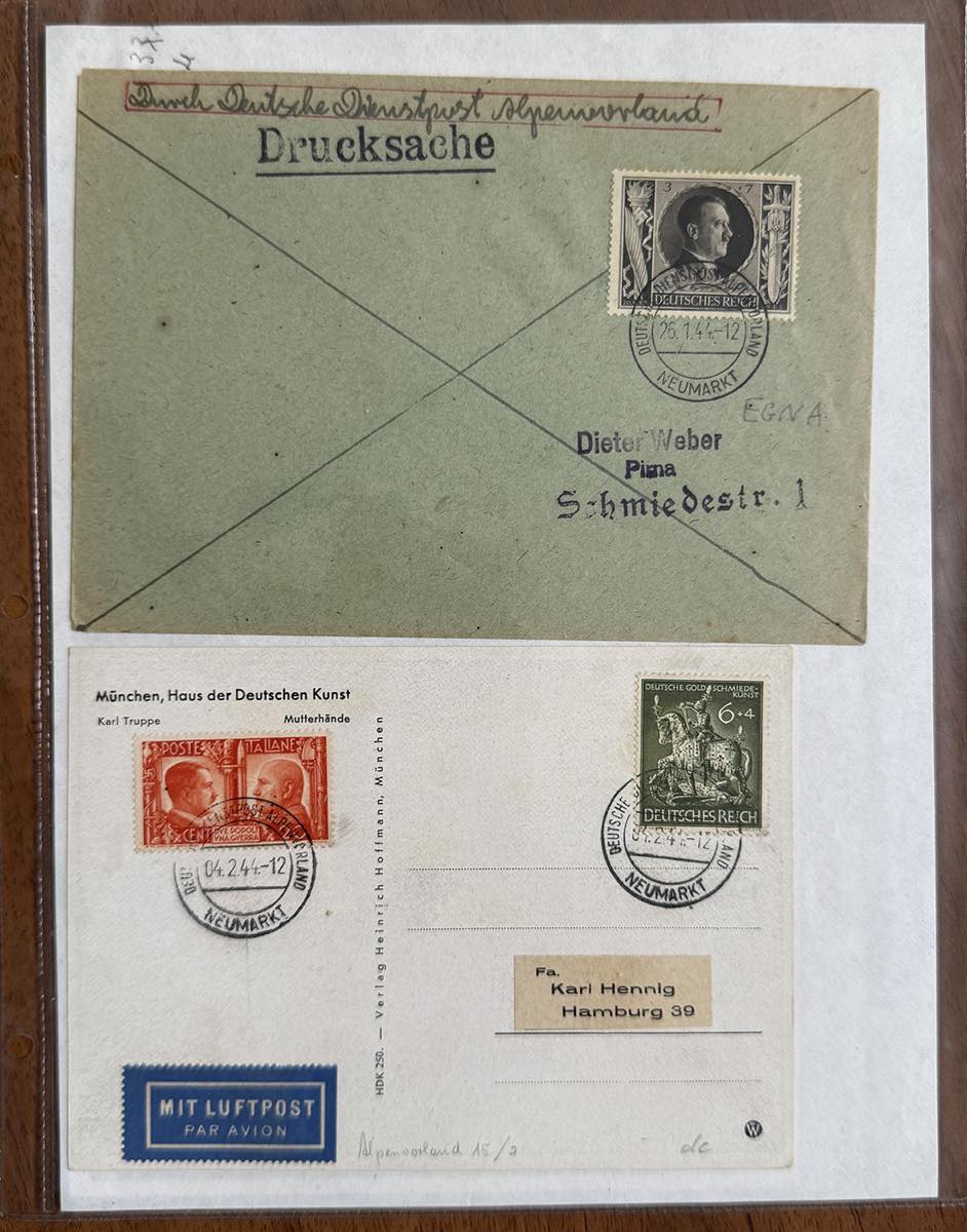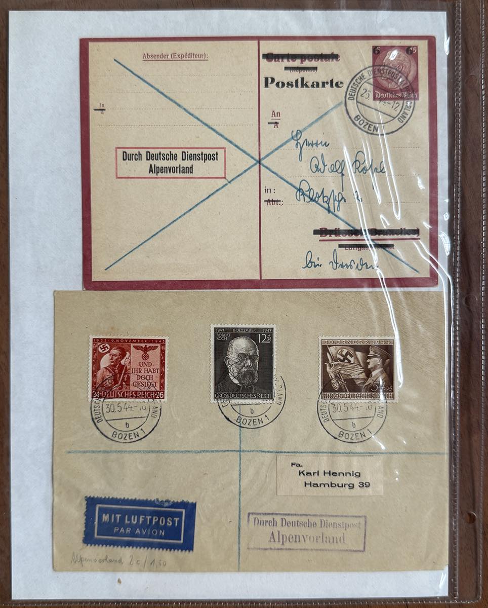 GERMANIA REICH ALPENVORLAND 1943/1944 - Bell'insieme di 42 lettere di Deutsche Dienspot Alpenvorland con varietà di affrancature e annullamenti, anche non comuni e di pregio. Merita esame.