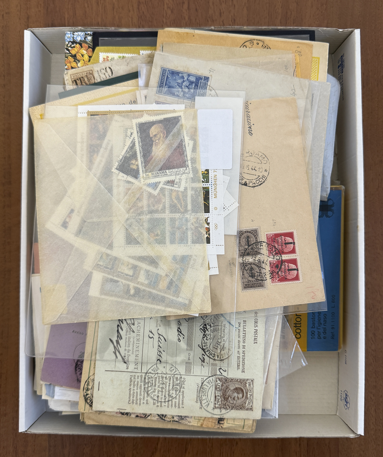 MISCELLANEA - Disordinata accumulazione di francobolli nuovi e usati, anche in fogli, erinnofili, buste generalmente affrancate, annulli manifestazioni filateliche e quant'altro, in uno scatolone. Divertente.