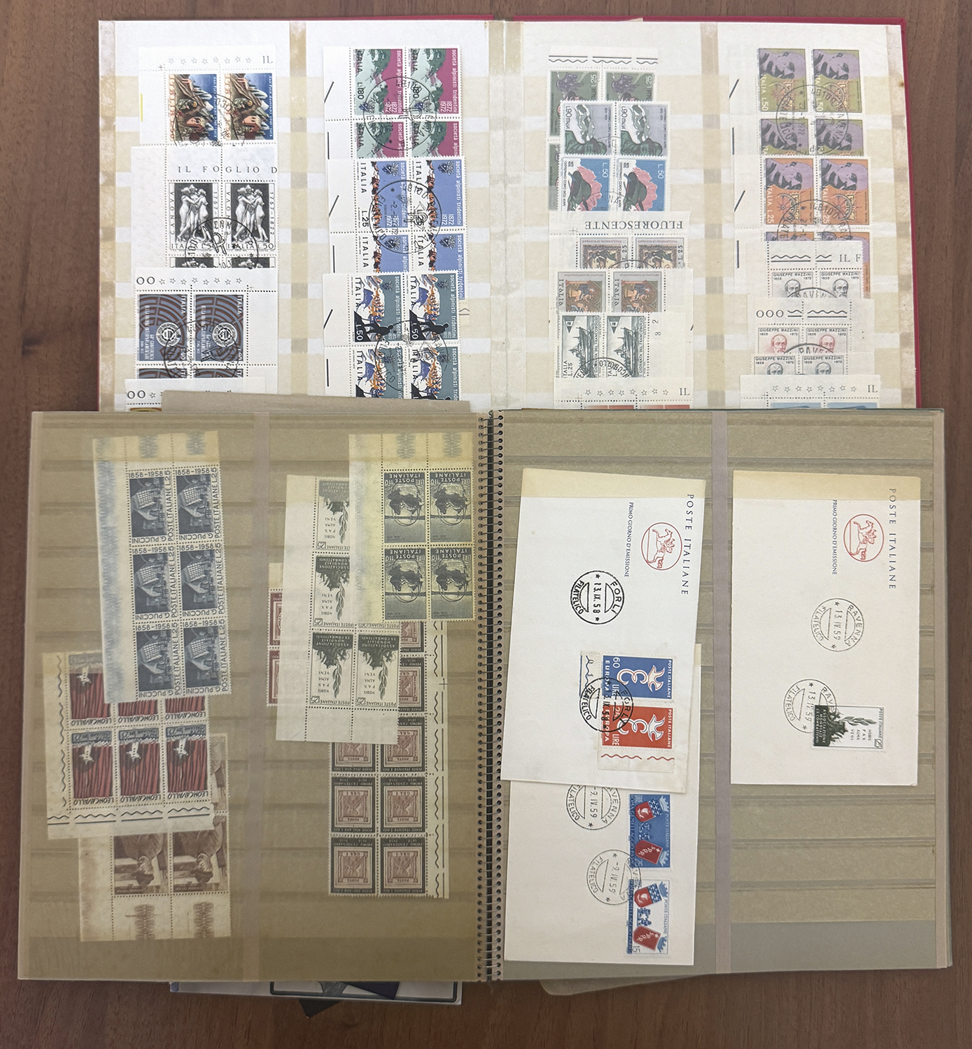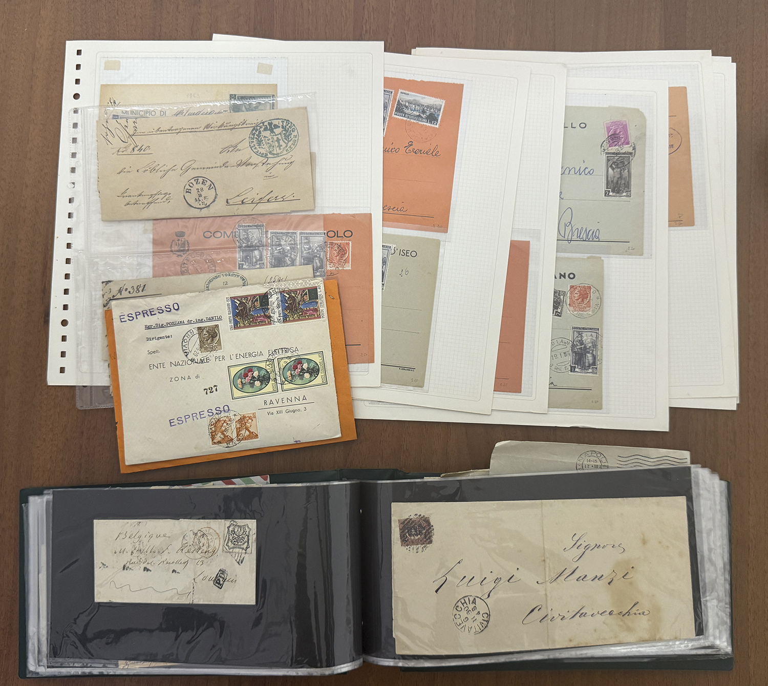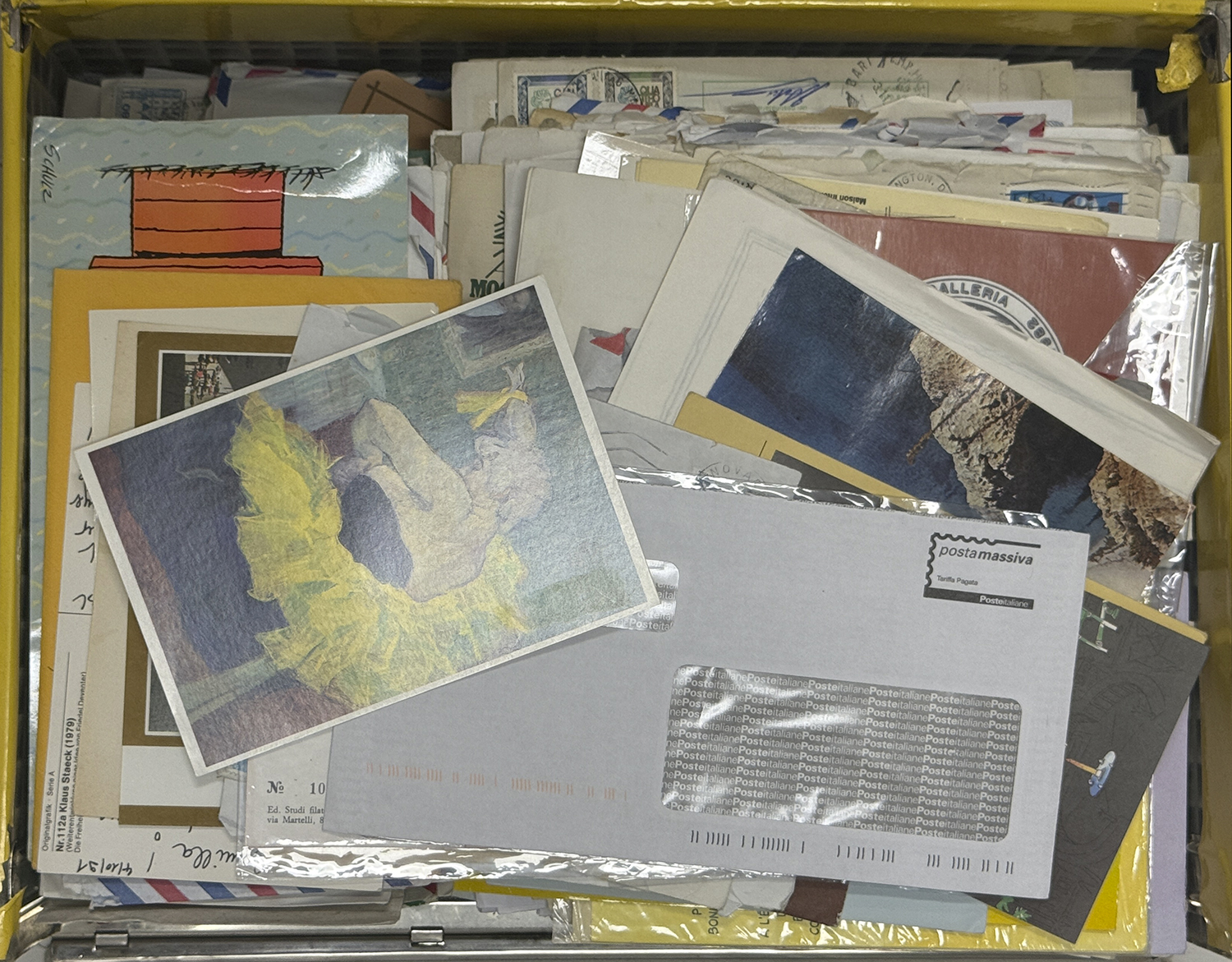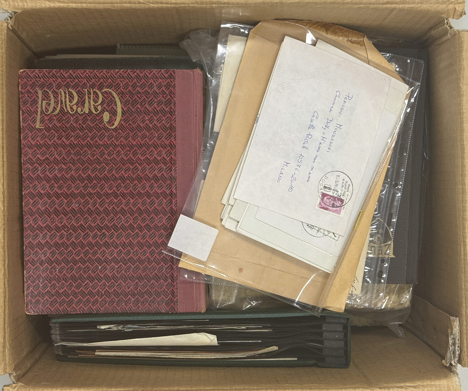 MISCELLANEA - Disordinata accumulazione di francobolli, buste e bollettini pacchi, prevalentemente della Repubblica Italiana, ma con qualche presenza anche dello Stato Pontificio in uno scatolone. Divertente.
