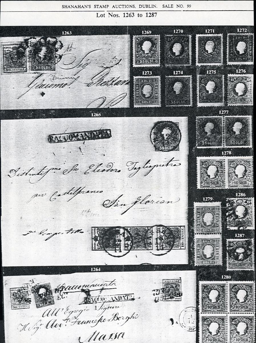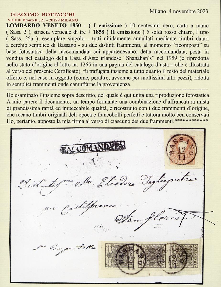 1858 - 10 cent. nero, carta a mano, striscia verticale di tre e 5 soldi rosso chiaro, I tipo (2,25a), perfetti, su due distinti frammenti, tutti annullati a Bassano 12/11. I due frammenti sono stati ricollocati nella posizione originaria su una fotocopia della raccomandata a cui appartenevano e che venne posta in vendita nel 1959 dalla Casa d'aste irlandese Shanahan's lotto 1265. L'intera vendita venne trafugata e le lettere furono ridotte a frammenti nel tentativo di camuffarne la provenienza. Interessante insieme, un tempo costituente un'affrancatura mista di grandissima rarità e di qualità impeccabile, ora vivida testimonianza di uno dei più estesi e gravi "delitti filatelici". Dettagliato cert. Bottacchi. Allegata fotocopia della pagina del catalogo d'asta.