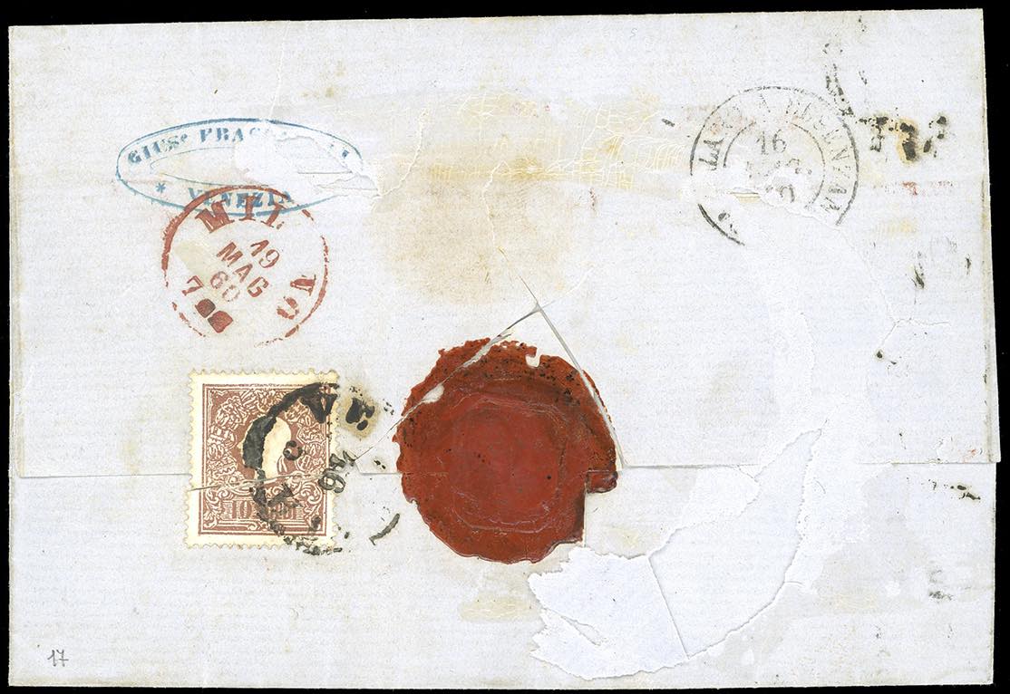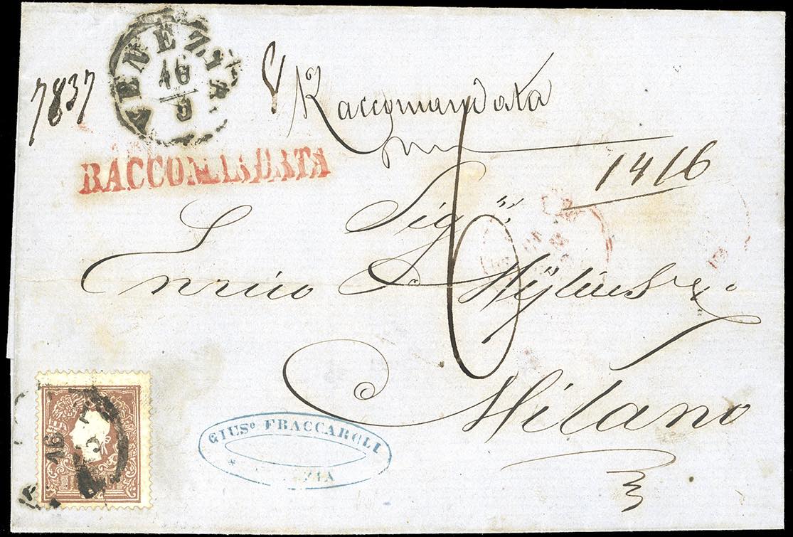 1860 - 10 soldi bruno, II tipo (31), un esemplare al recto, perfetto e uno al verso, danneggiato all'apertura, su lettera raccomandata da Venezia 16/6/1860 a Milano, tassata in arrivo 60 cent.