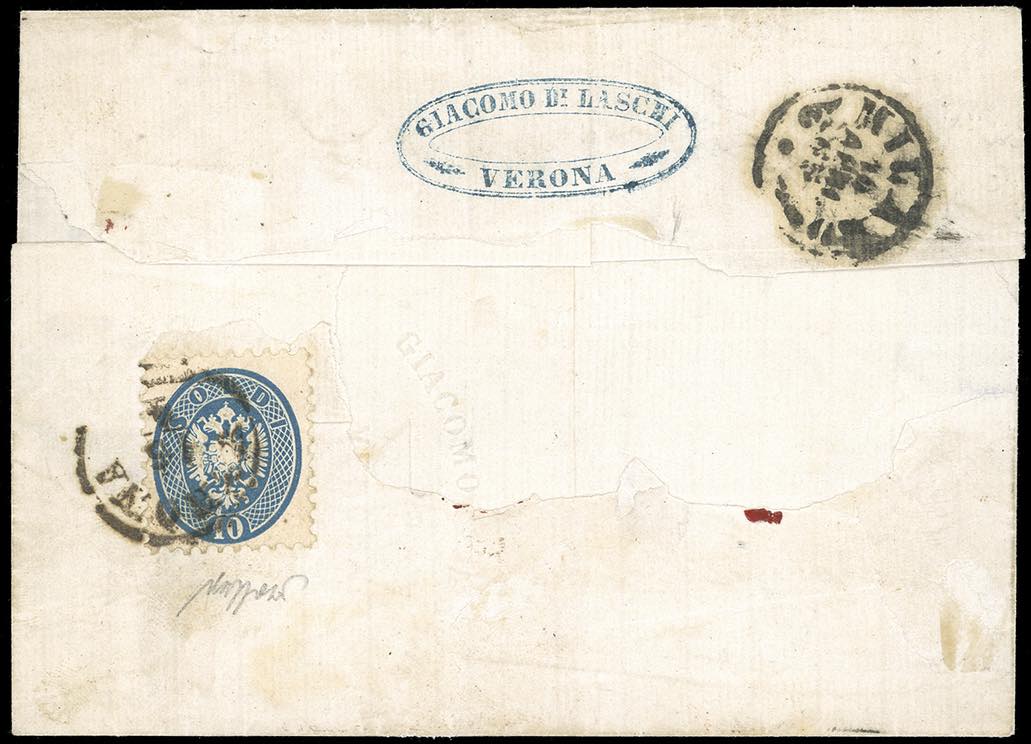 1865 - 3 soldi verde, coppia verticale, e 10 soldi azzurro, due esemplari, di cui uno applicato al verso per il diritto di raccomandazione, tutti dent. 9 1/2 (42,44), perfetti, su busta raccomandata, parzialmente incompleta al verso, da Verona 5/4/1865 a Milano. Cert. Caffaz.