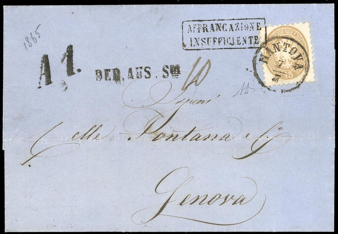 1865 - 15 soldi bruno, dent. 9 1/2 (45), perfetto, su fresca lettera da Mantova 7/7/1865 a Genova, sul fornte bolli "A1", "Deb.Aus.S." e "affrancatura insufficiente" parziale coannullatore. Nonostante i diversi bolli accessori, la lettera non venne tassata in arrivo. Interessante e di ottima qualità. A.Diena e Zanaria.