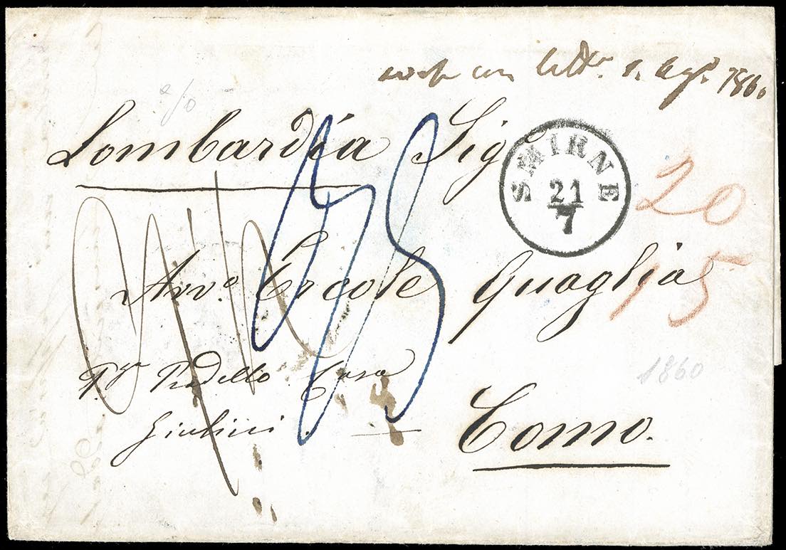 1860 - Lettera in porto assegnato da Smirne 21/7/1860 a Como, trasportata dal Lloyd Austriaco a Trieste e da qui, via di terra, a Desenzano per poi proseguire , via Milano, a destino. Numerosi segni di tassa sul fornte. Interessante documento perché, anche se non affrancato, non è stato instradato per la via di Svizzera.