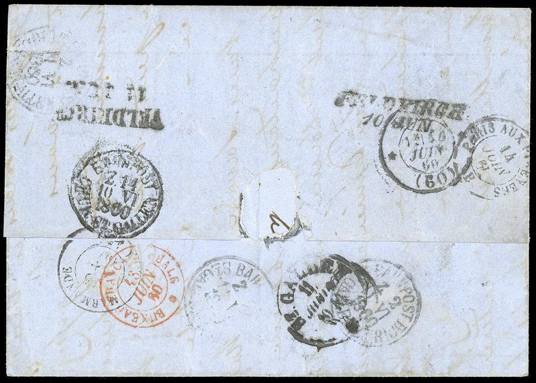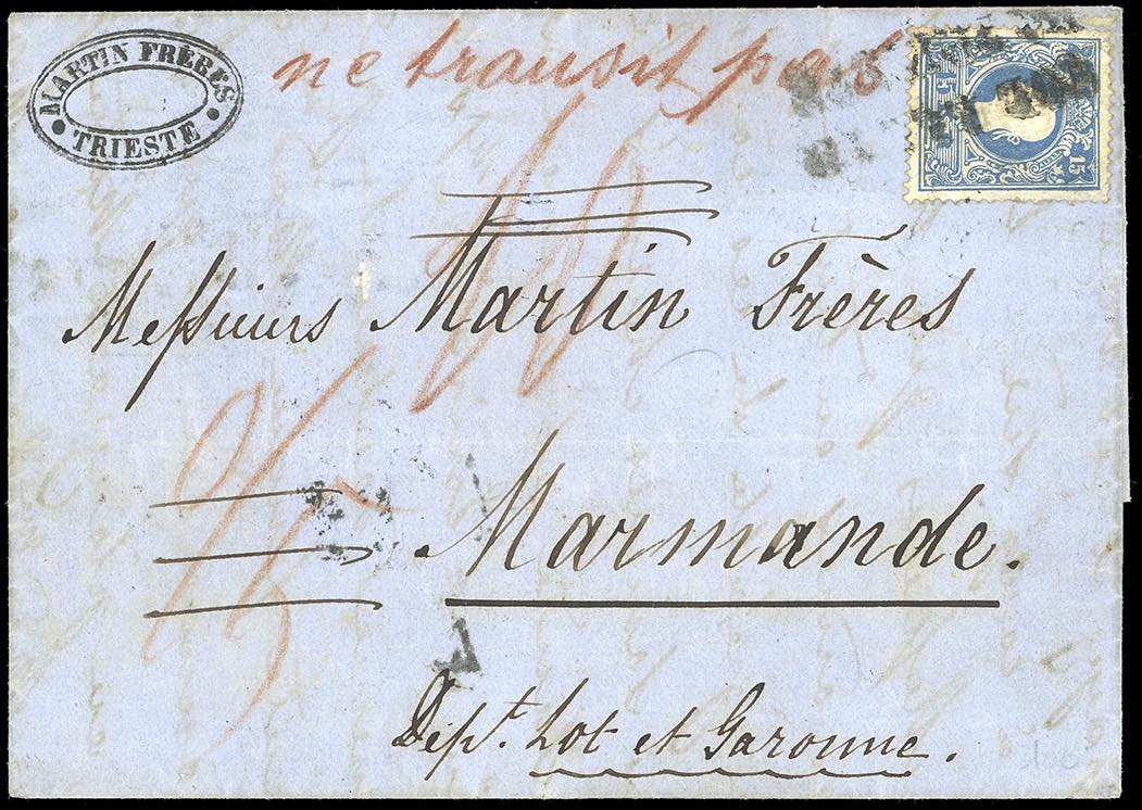 1860 - Lettera da Trieste, in Austria, per Marmande, in Francia, del 9/6/1860 affrancata con 15 kr. azzurro, tariffa sino al confine Austria-Svizzera. La lettera transitò per Feldkirch, St. Gallen, Zurigo, Basilea, Parigi e quindi giunse a Marmande il 15 giugno, bolli di transito e arrivo al verso, segni di tasse cancellati e dicitura "Ne transit pas". Rara e interessante via di Svizzera.
