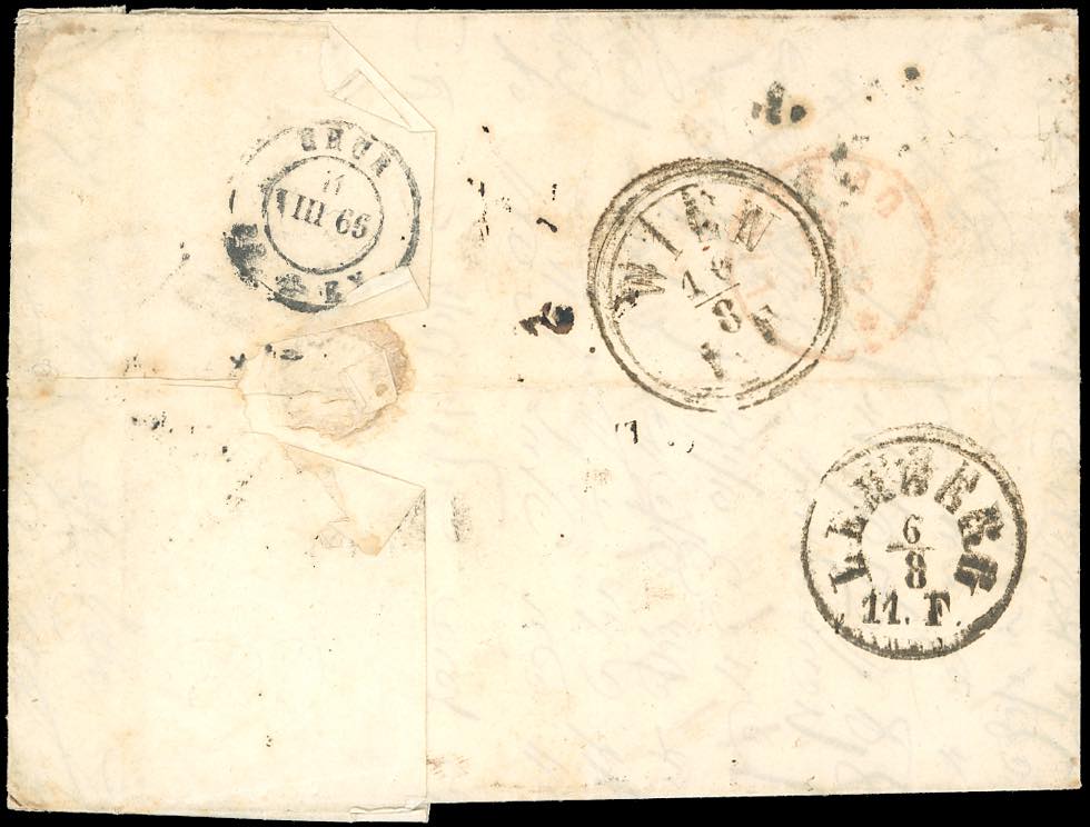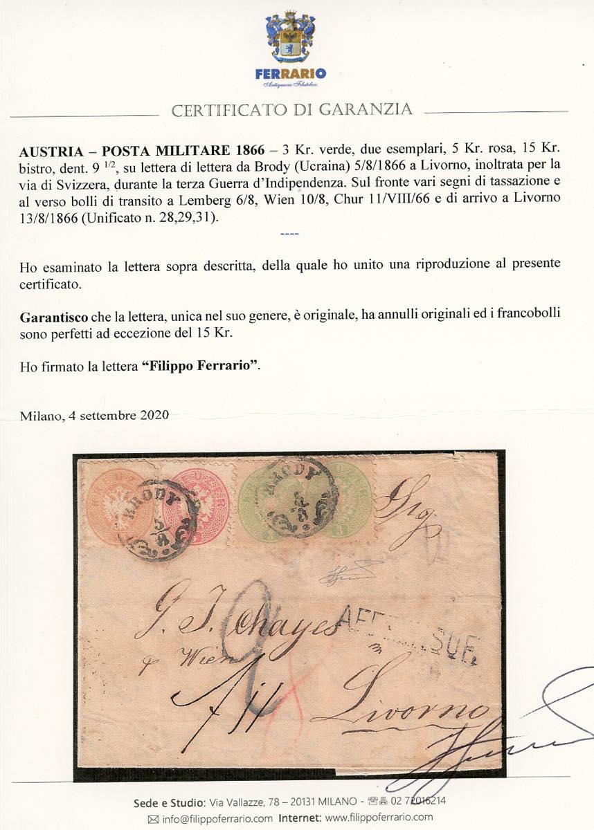 1866 - 3 kr. verde, due esemplari, 5 kr. rosa, 15 kr. bistro, tutti dent. 9 1/2 (Unificato 28,29,31), perfetti ad eccezione del 15 kr. che presenta un angolo arrotondato, su lettera da Brody 5/8/1866 a Livorno inoltrata per la via di Svizzera (al verso il transito di Chur 11/8/1866), a causa delle ostilità della III Guerra d'Indipendenza, affrancata insufficientemente e tassata. Insieme unico, di eccezionale interesse. Cert. Ferrario.