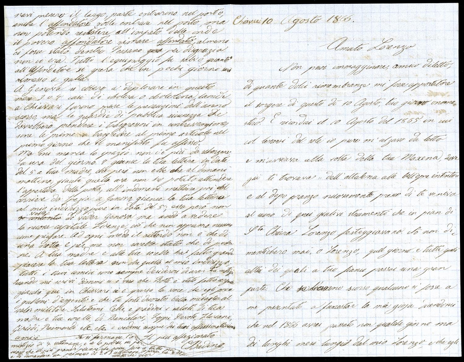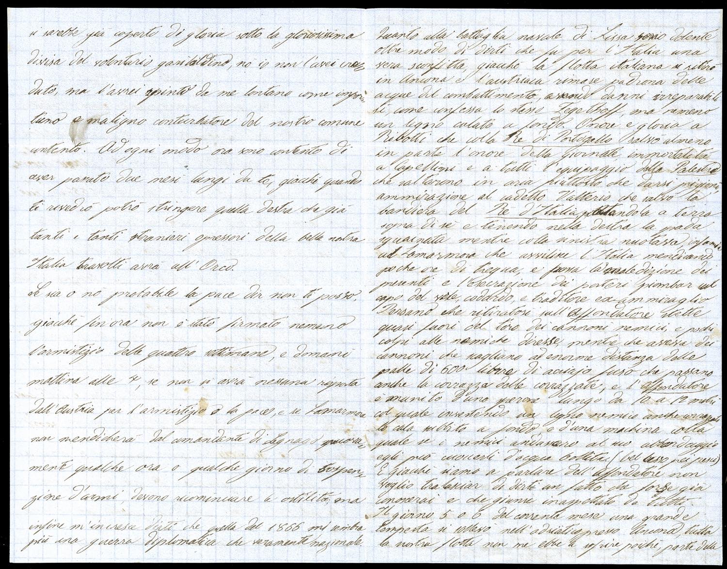 1866 - 5 cent. De La Rue, tiratura di Londra (L16), due esemplari con lievi difetti, su busta in tariffa militare da Chiavari 10/8/1866 indirizzata ad un Bersagliere volontario in zona di guerra, al verso bolli in transito di Genova e di Piacenza. Interessante testo storico interno.