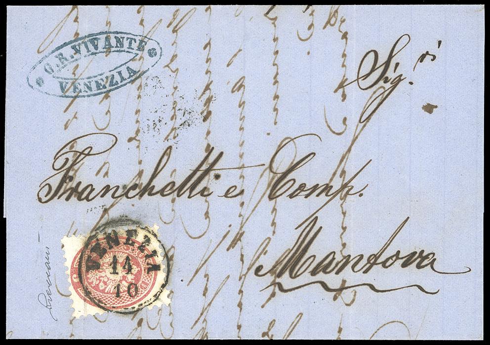 1866 - 5 soldi rosa, dent. 9 1/2 (43), lieve piega, su fresca lettera da Venezia 14/10/1866 a Mantova. Interessante lettera risalente agli ultimi giorni prima del definitivo passaggio del Veneto all'Italia. L'affrancatura fu ritenuta valida per l'accordo del 20/9/1866: le lettere potevano essere affrancate con la tariffa interna dello Stato di provenienza ed avevano il diritto di essere recapitate a destino senza tassazioni. Cert. Vaccari.