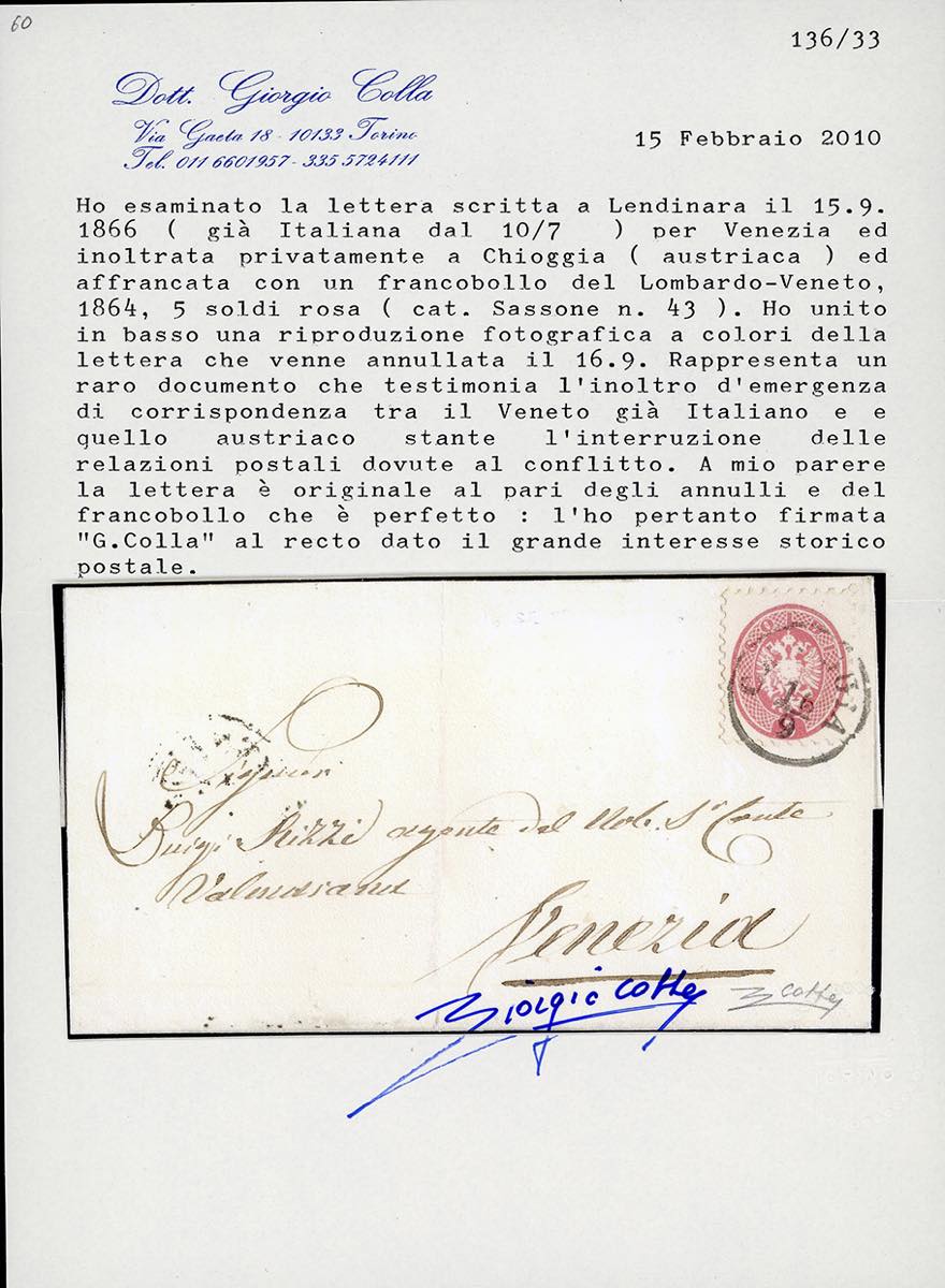 1866 - 5 soldi rosa, dent. 9 1/2 (43), perfetto, su fresca lettera scritta a Lendinara il 15/9/1866 (già italiana dal 10 luglio) per Venezia, inoltrata privatamente a Chioggia (ancora austriaca), dove venne messa in posta il giorno 16 settembre. Interessante e rara testimonianza di inoltro" d'emergenza" di corrispondenza tra il Veneto già italiano e quello austriaco, stante l'interruzione delle relazioni postali dirette a causa del conflitto in essere. Documento di grande interesse storico postale. Dettagliato cer. Colla.