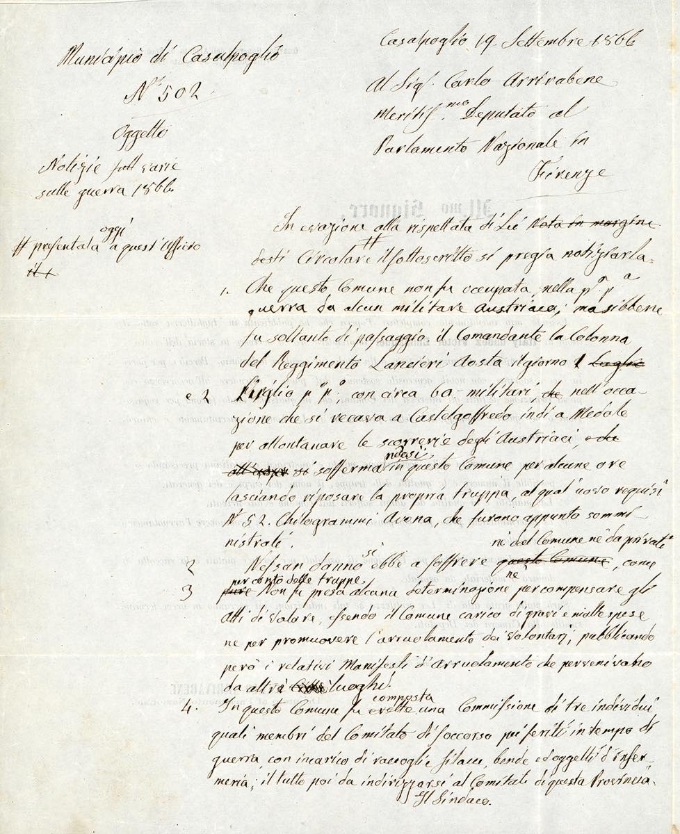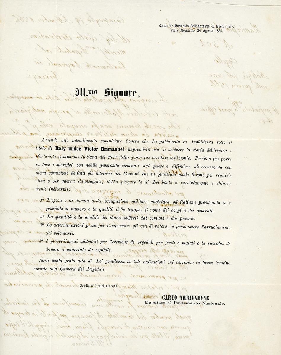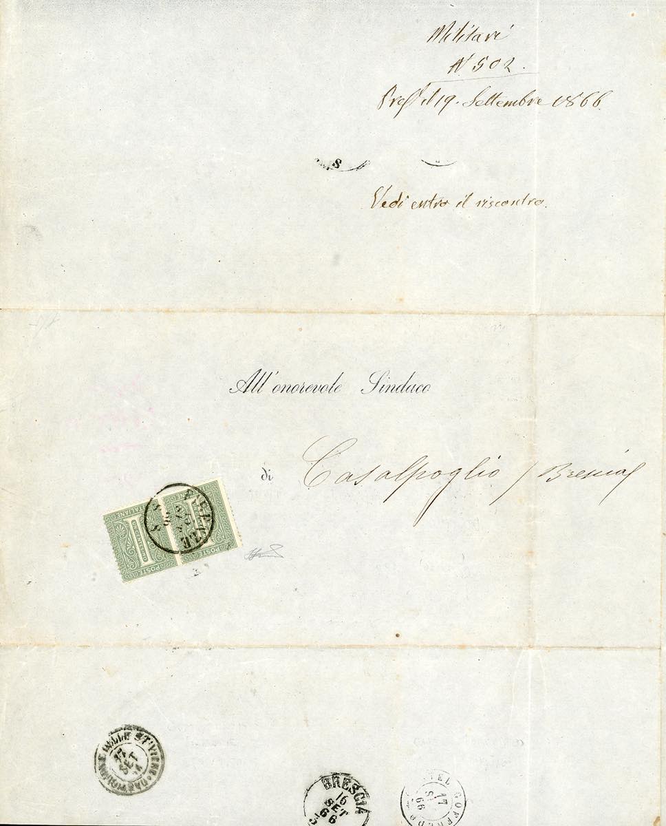1866 - 1 cent. De La Rue, tiratura di Londra (L14), coppia, perfetta, su circolare a stampa da Firenze 15/9/1866 a Casalpoglio. Nel testo interno, a firma del Deputato C.Arrivabene, si legge una richiesta di informazioni in ordine ai fatti della III Guerra d'Indipendenza, in vista della pubblicazione di un libro sul tema. Molto interessante.