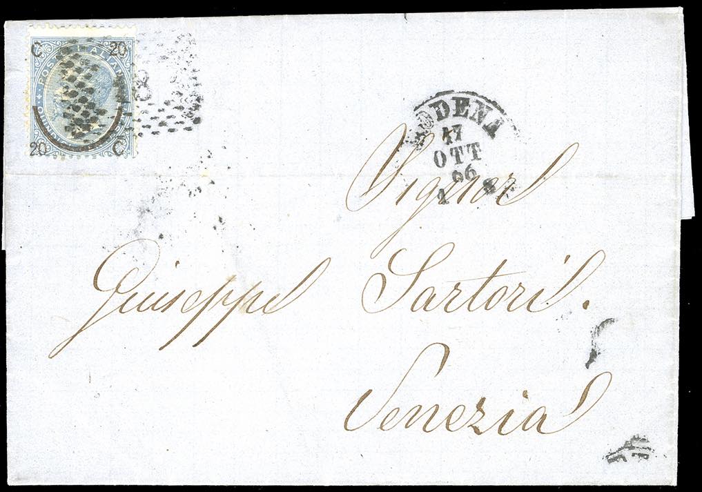 1866 - 20 cent. su 15 cent. Ferro di cavallo, II tipo (24), perfetto, su lettera da Modena 17/10/1866 a Venezia, dove arrivò il successivo ... Leggi tutto