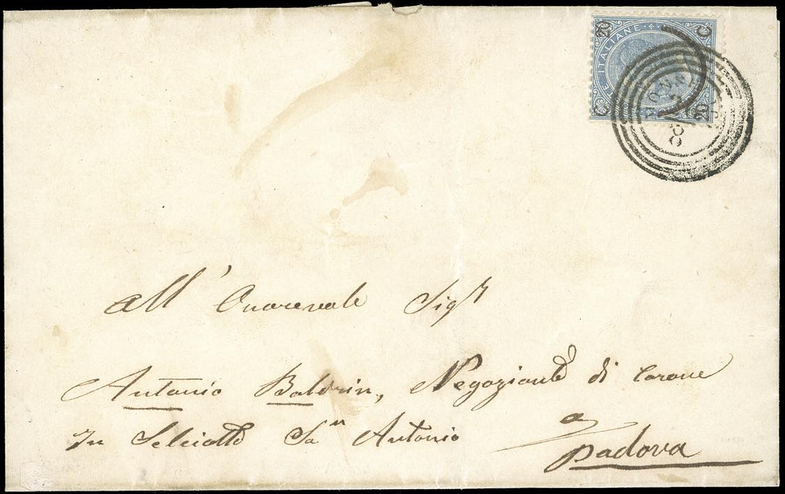 1866 - 20 cent. su 15 cent. Ferro di cavallo, II tipo (Regno 24), perfetto, su lettera da Monselice 26/8/1866 (punti 10) a Padova.