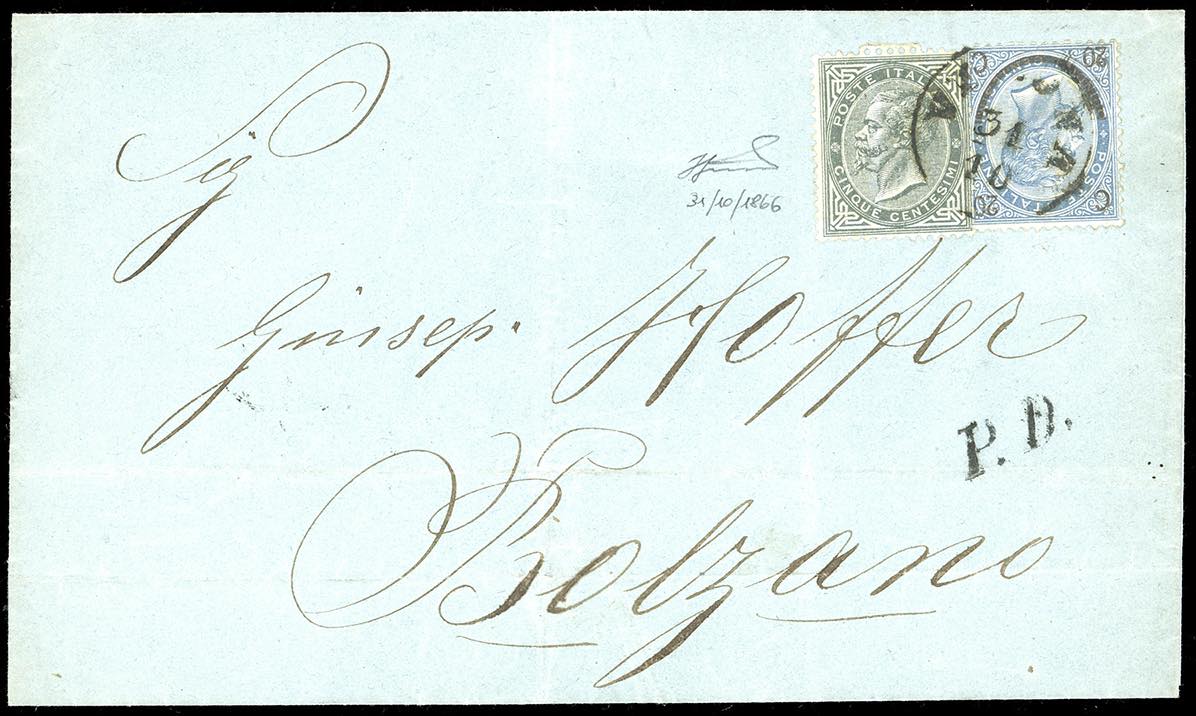 1866 - 5 cent. De La Rue, 20 cent. su 15 cent. Ferro di cavallo, III tipo (Regno 25), perfetti, su lettera da Verona 31/10/1866 a Bolzano. Interessante lettera risalente al giorno di annessione ufficiale del Veneto all'italia, dopo i risultati del plebiscito del 21 ottobre. Molto bella. Ferrario.