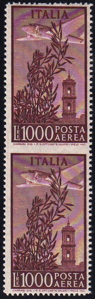 1952 - 1.000 lire Campidoglio, filigrana ruota, dent. 14 1/4 x 13 1/4, coppia verticale non dentellata al centro (145Ac), gomma integra, perfetta. Rara.