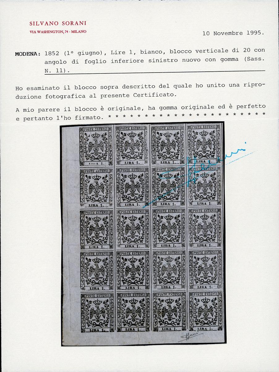 1853 - 1 lira bianco (11), blocco di 20 esemplari, angolo di foglio, gomma originale integra, 4 esemplari con traccia di linguella, perfetto e di ottima qualità. Ferrario, cert. Sorani.
