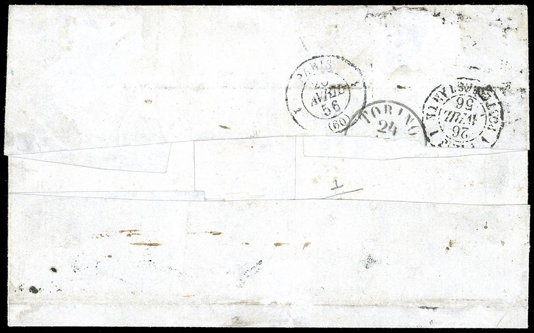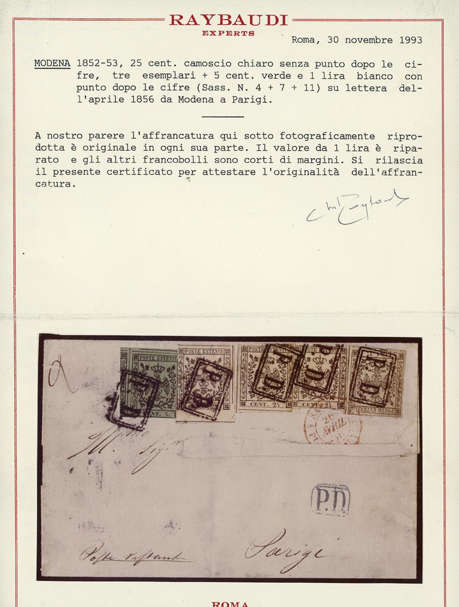 1856 - 1 lira bianco, riparato, 25 cent. tre esemplari e 5 5 cent. verde (11,4,7), su lettera di doppio porto da Modena, annullo P.D., a Parigi, giunta il 26 aprile 1856. Rara affrancatura tricolore, non censita dal Sassone. Cert. Raybaudi.