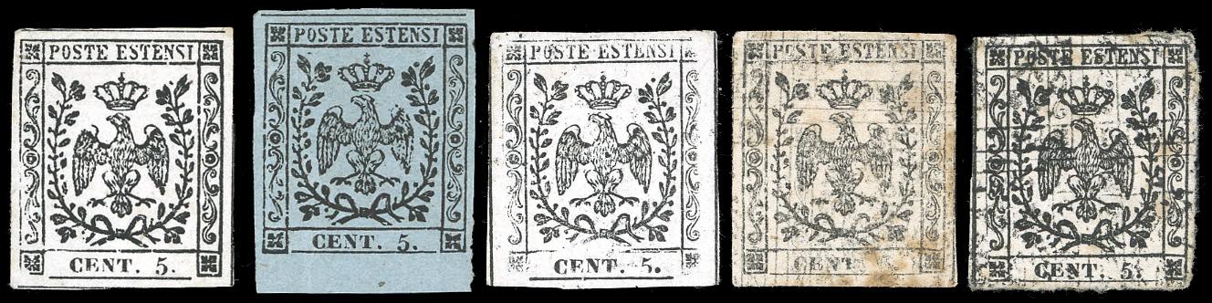 1852 - Cinque prove del periodo, tra cui una su carta celeste chiaro e due con doppia stampa, nuove, senza gomma come sempre, generalmente di buona qualità. Quattro firmate da noti periti.