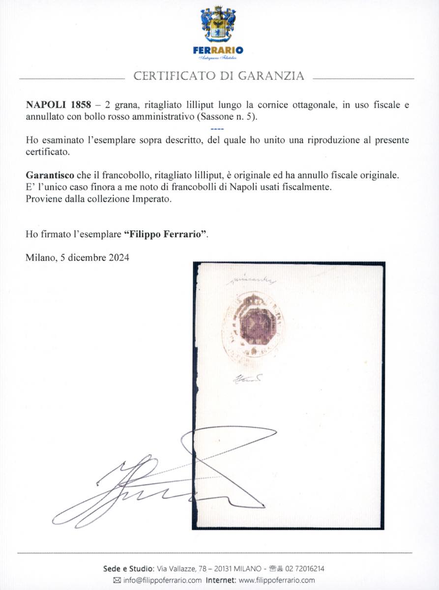 1858 - 2 grana, ritagliato lilliput lungo la cornice ottagonale, in uso fiscale e annullato con bollo rosso amministrativo. UNICO CASO NOTO, per collezionista avanzato e specializzato, da esposizione. Chiavarello (per esteso), cert. Ferrario. Ex coll. Imperato.