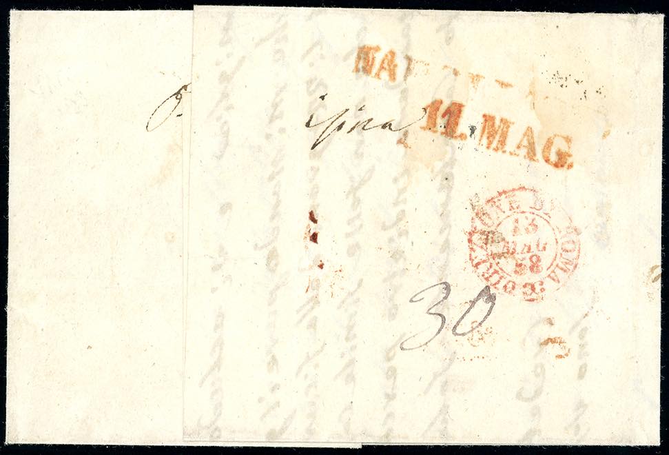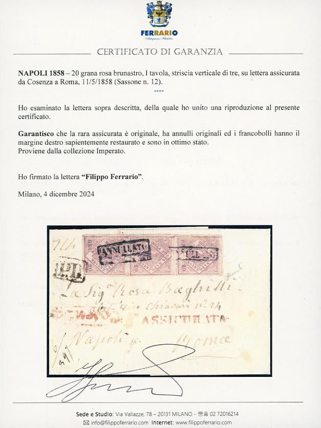 1858 - 20 grana rosa brunastro, I tavola (12), striscia verticale di tre, margine destro dei francobolli sapientemente restaurato, su lettera assicurata da Cosenza a Roma, 13/5/1858. Estremamente rara e di ottimo aspetto. Cert. Ferrario. Ex coll. Imperato.