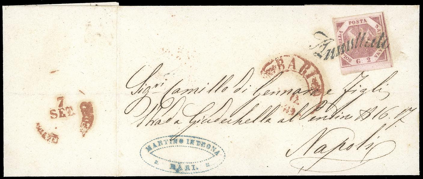 1860 - 2 grana rosa carminio, III tavola (7c), perfetto, su lettera da Bari 4/9/1860, annullo a svolazzo, a Napoli, dove giunse il 7/9/1860, giorno in cui il Generale Garibaldi entrò nella città e assunse la Dittatura anche del Napoletano. Di grande interesse, per specialista.