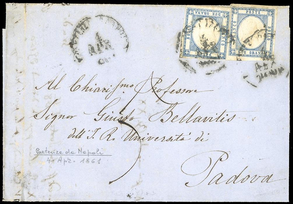 1861 - 2 grana azzurro chiaro (20), due esemplari, lievi difetti, su lettera da Napoli 1/4/1861 a Padova, tassata 5 soldi, insolita ... Leggi tutto