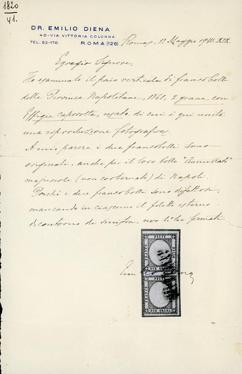 1861 - 2 grana azzurro, EFFIGIE CAPOVOLTA (20f), coppia verticale, margine sinistro intaccato, usato con il lineare annullato in rosso. Rarissimo multiplo di questa affascinante varietà. Chiavarello, cert. Storico Emilio Diena (1941) e Bottacchi. Ex coll. Imperato.