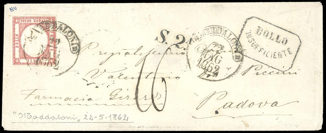 1862 - Lettera da Maddaloni per Padova del 22/5/1862 affrancata con 5 grana (21), al verso bolli di transito di Napoli (22/5), Milano (24/5) e di arrivo a Padova del 25/5. Sul fronte “Bollo Insufficiente” e tassata integralmente per 16 soldi senza tener conto dell’affrancatura corrispondente a 20 cent. (sarebbe dovuta essere affrancata per 10 grana dalla 2a distanza italiana alla 1a distanza austriaca). Fino al 30 settembre 1862, la corrispondenza veniva tassata come se non fosse affrancata. Interessante e rara.