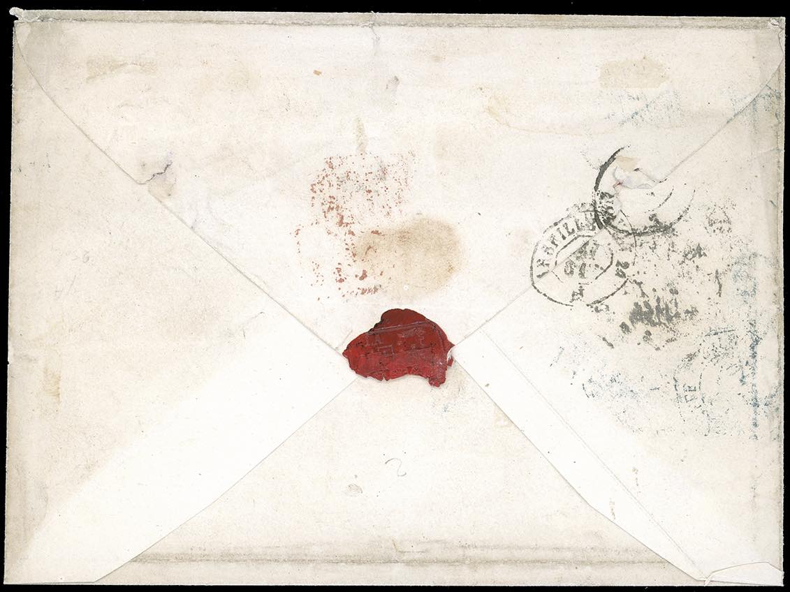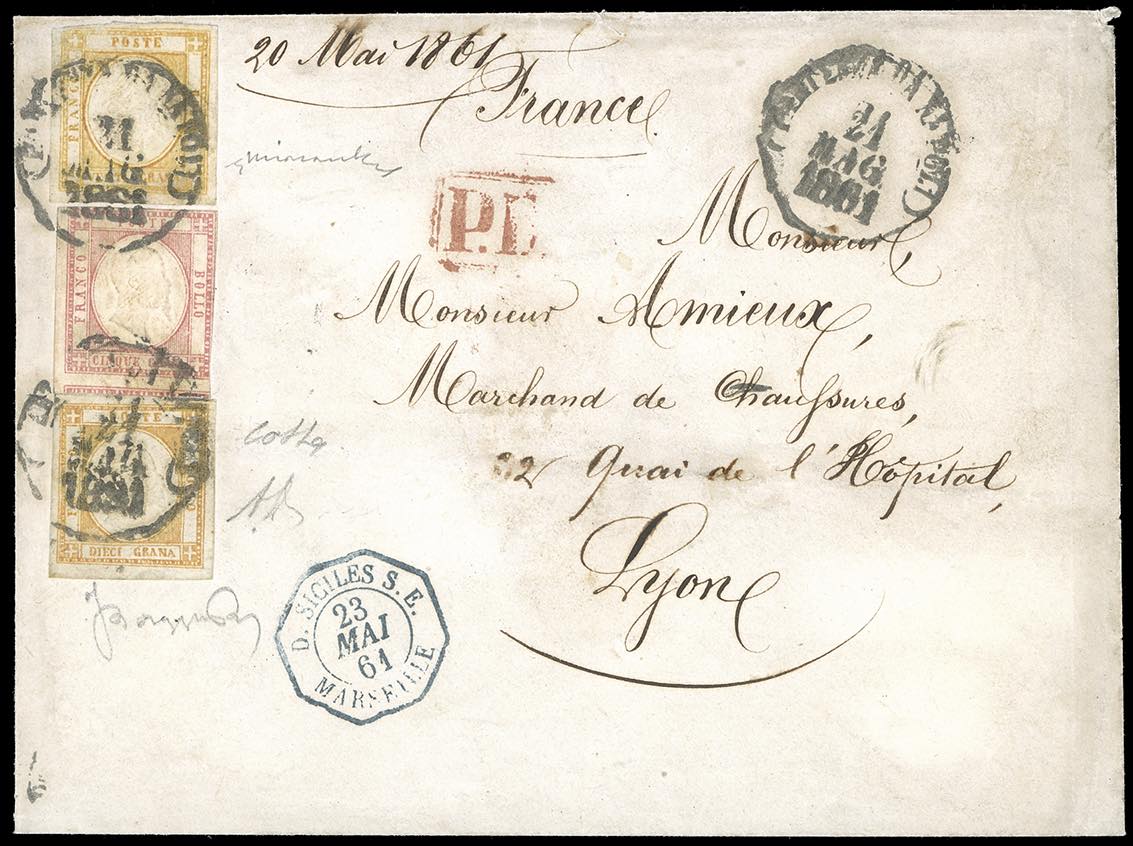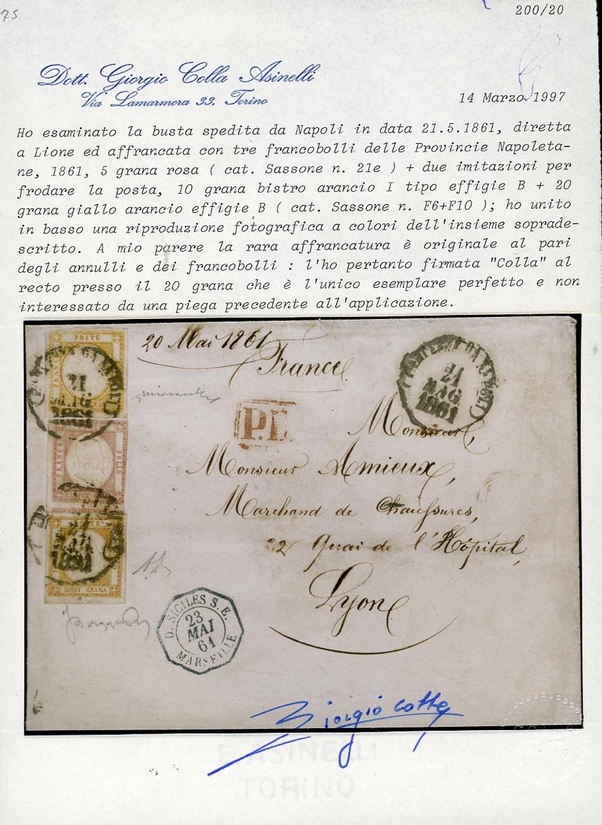 1861 - 20 grana giallo arancio, 10 grana bistro arancio, I tipo, entrambi falsi per posta con effigie di tipo B, 5 grana rosa (F10,F6,21e), lievi difetti, ad eccezione del 10 grana, che è perfetto, su lettera da Napoli 21/5/1861 a Lione, in Francia. Affrancatura estremamente rara con due falsi per posta. Bargagli, Chiavarello, cert. A.Diena e Colla.