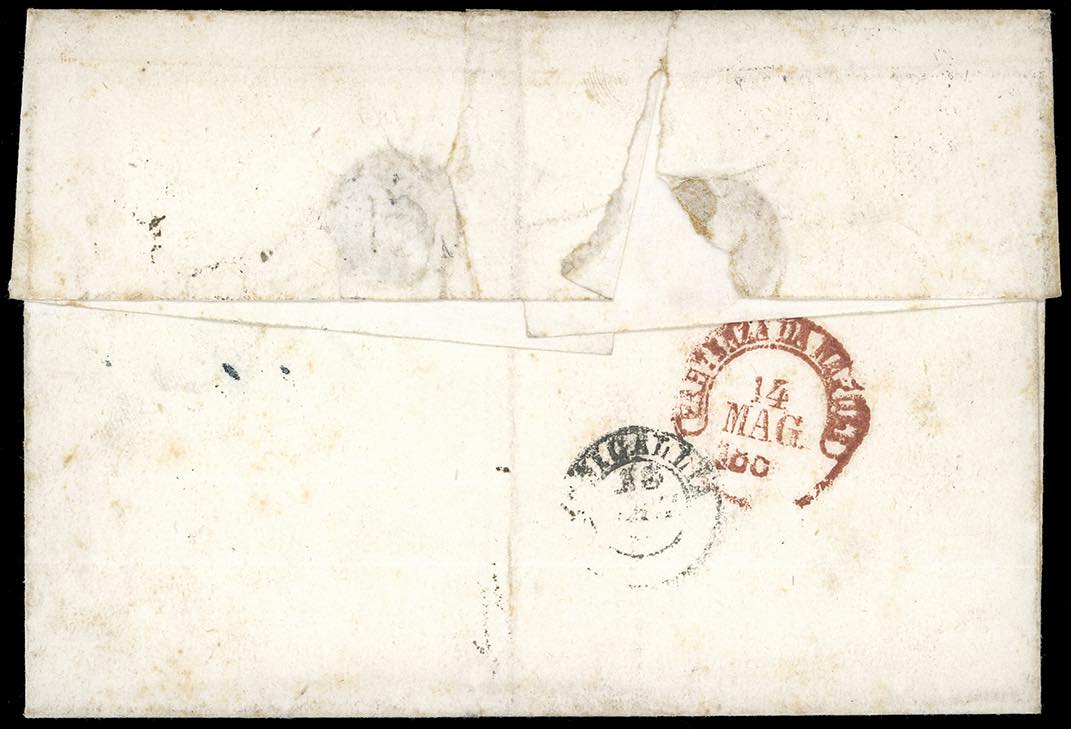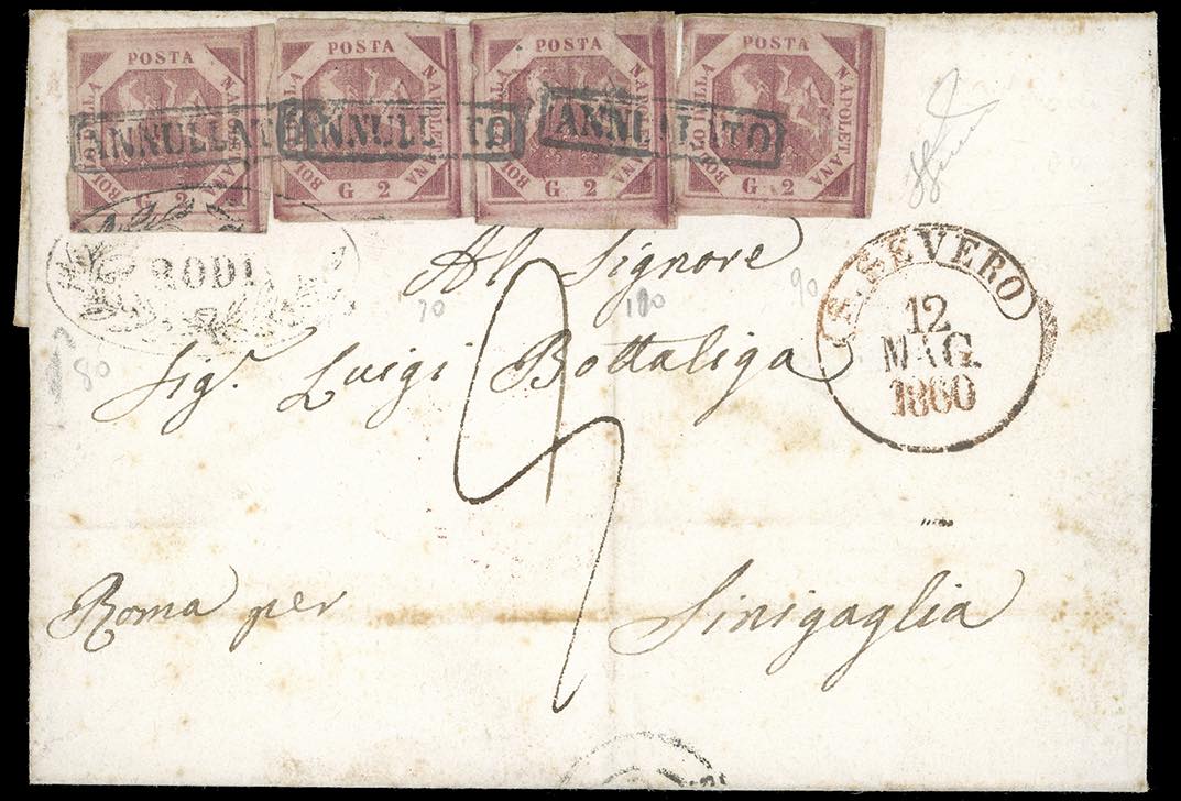 RODI, ovale con ornati punti R2 - 2 grana (5f), quattro esemplari, tutti bordo di foglio a destra, uno con piega verticale, su lettera per Senigallia, tassata 9 baj, sul fronte il transito di S.Severo. Il rarissimo bollo di Rodi è eccezionalmente impresso sul fronte come coannullatore. Insieme probabilmente unico! Cert. Ferrario. Ex coll. Imperato.