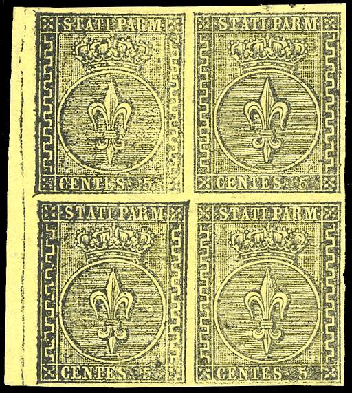 1852 - 5 cent. giallo arancio (1), blocco di quattro, bordo di foglio, nuovo, gomma originale, integra per due esemplari, perfetto. ... Leggi tutto